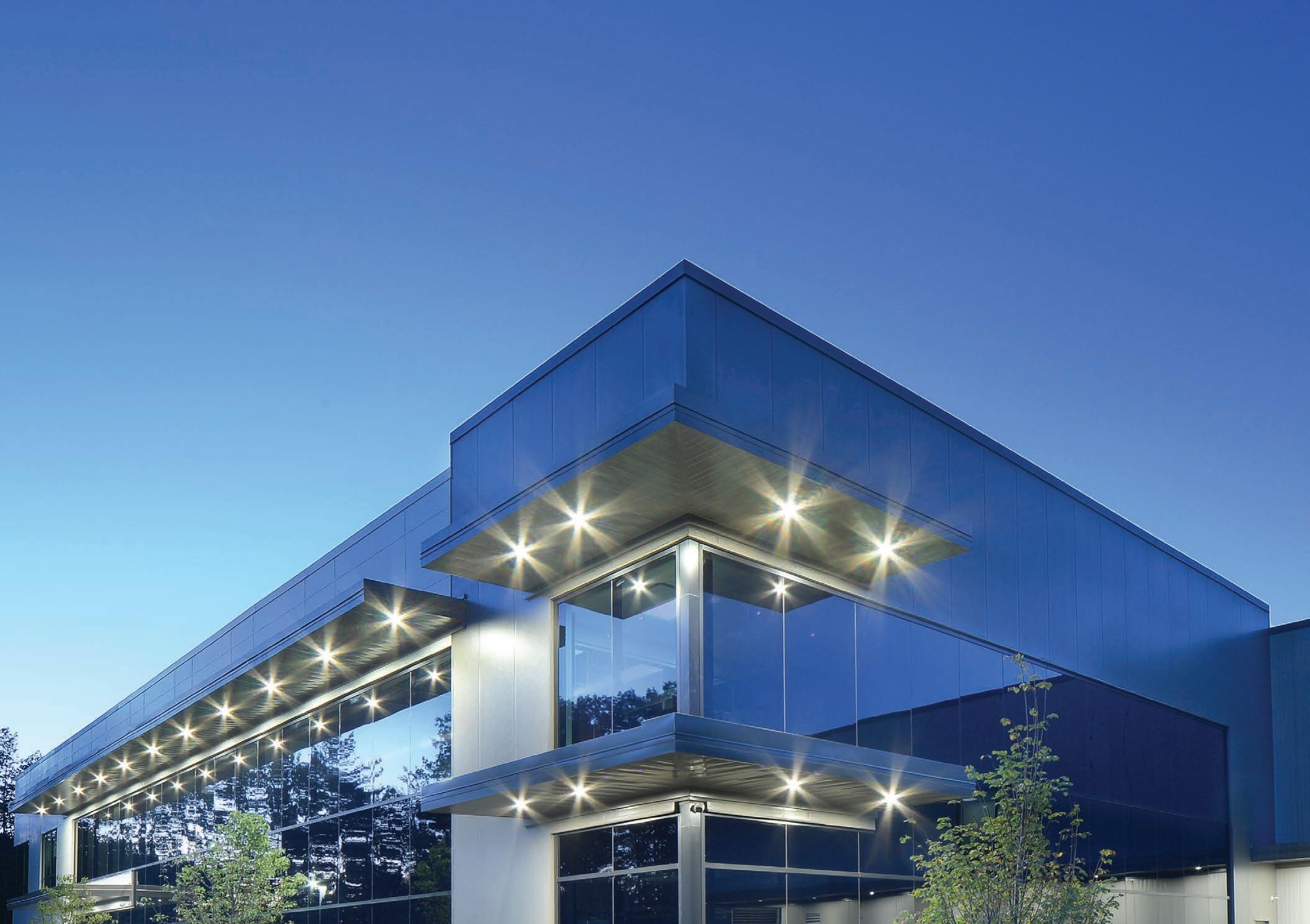 The exterior is comprised of phenolic panels, standing seam metal cladding, and linear metal panels, all on an exterior insulated girt assembly, providing a durable exterior finish and an energy-efficient assembly.