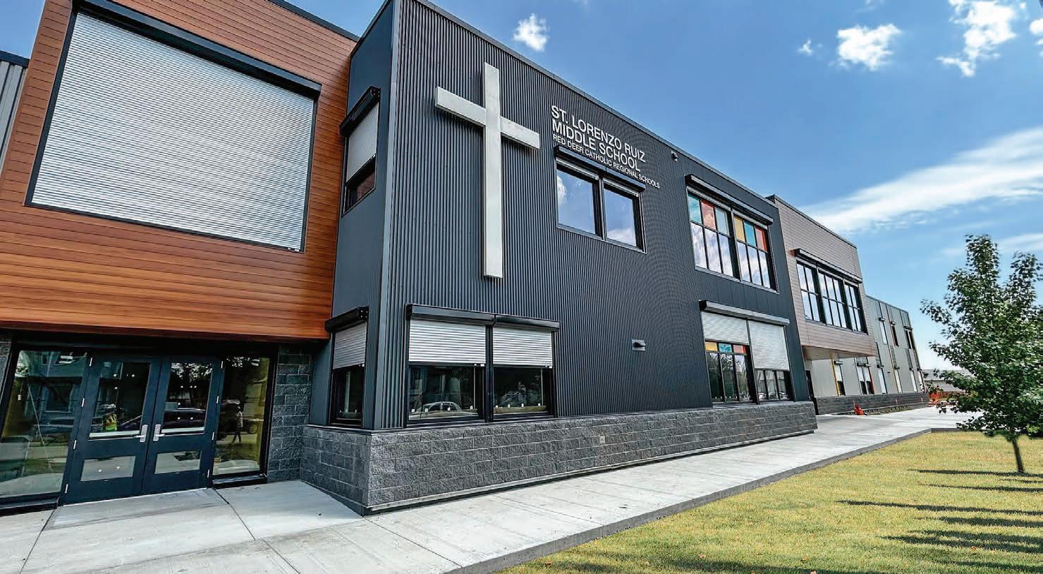 St. Lorenzo Ruiz Middle School was developed to accommodate up to 735 students in grades 6 to 9. The $28.2-million facility is located on a greenfield site in Kentwood, and while the narrow site dictated the overall massing of the facility, ambitious programming – as well as many pleasing architectural features – arose from extensive consultation with stakeholders beginning in January of 2021. “Extensive information was gathered from staff and stakeholders about what they wanted and didn’t want,” says Rod Steeves, secretary-treasurer at Red Deer Catholic Regional Division No. 39.