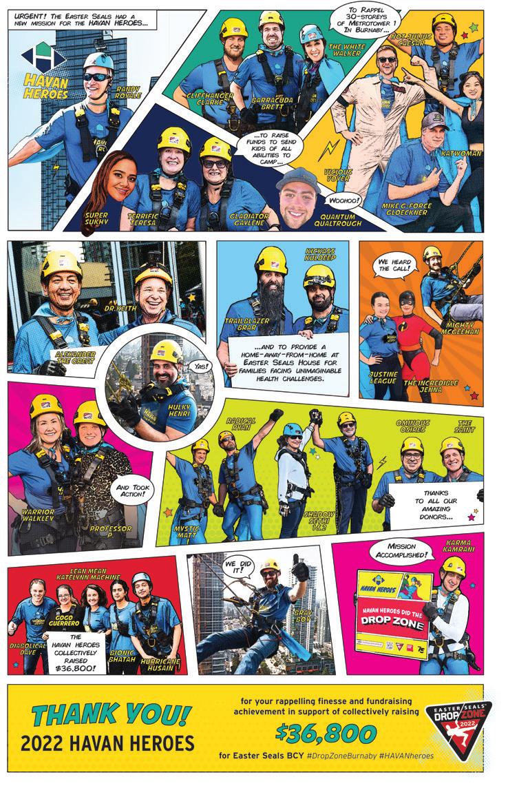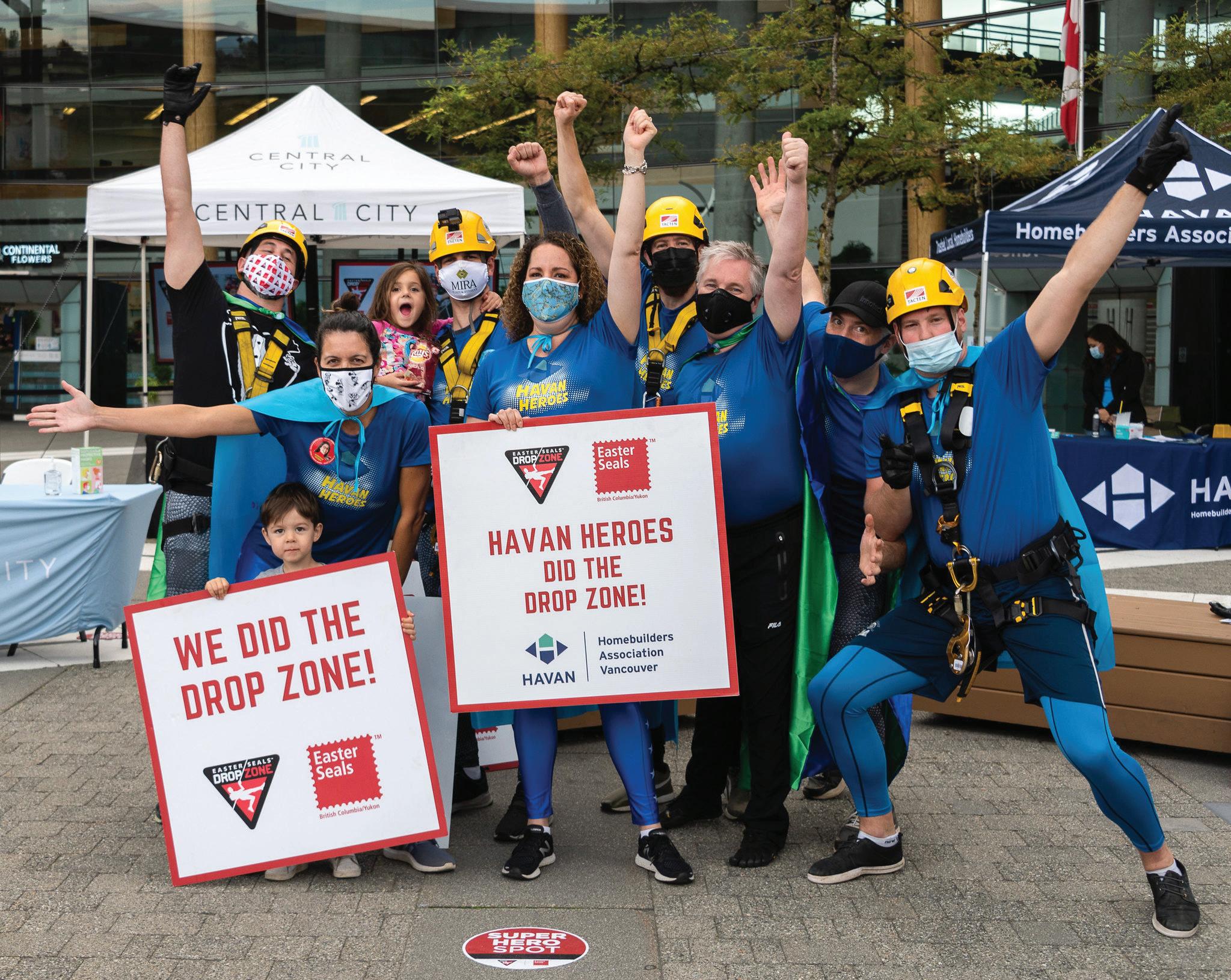 Starting in 2019 and continuing for four years, groups of as many as 36 association members jumped from the top of some of Metro Vancouver’s tallest towers and rappelled down the façade to the ground below. There were plenty of white knuckles and wobbly knees as these brave souls—each dressed in HAVAN T-shirt, tights, cape, and mask–harnessed themselves securely to what looked like an impossibly “thin” line and dropped out of sight over the edge.