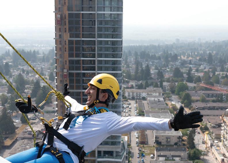 In 2019, 14 heroes rappelled 25 storeys (328 feet) down the side of the Guinness Tower at 1055 West Hastings Street in Vancouver raising $23,000. The following year, 25 heroes—including Wendy McNeil, acting CEO—took on the 25-storey City Central tower in Surrey raising an astonishing $55,000. The year 2021 saw 20 heroes plunge 28 storeys down the Metrotown Tower at Metropolis bringing in a total of $22,000. And in the final year, 2022, 36 heroes rappelled those same 28 storeys to raise $36,800.