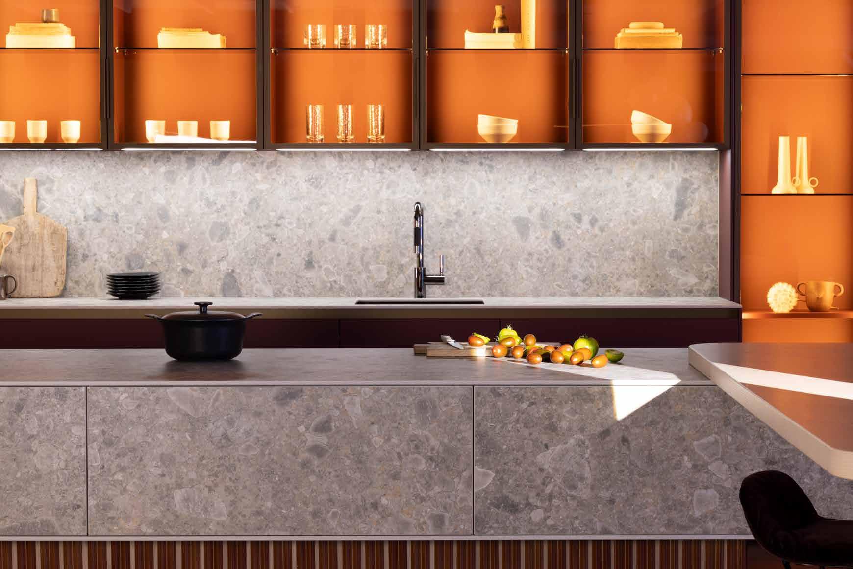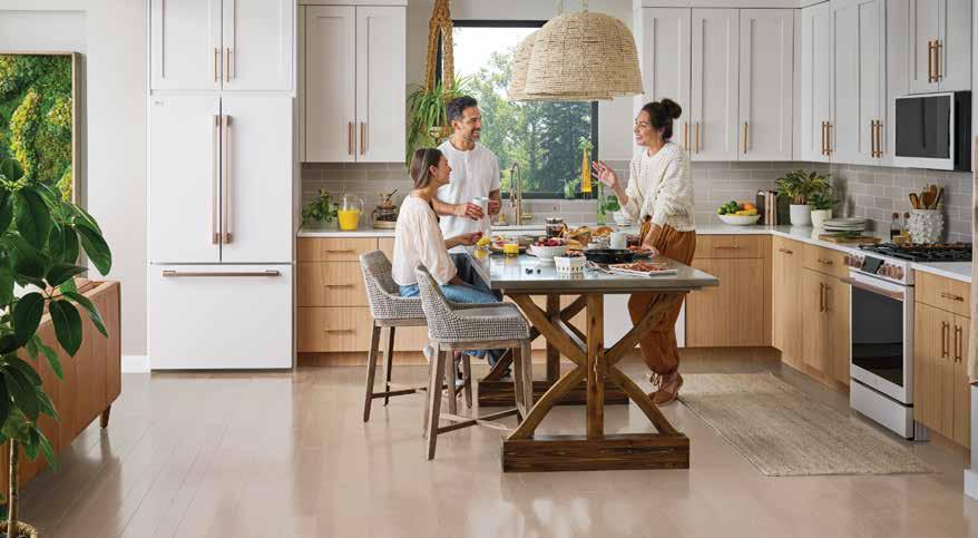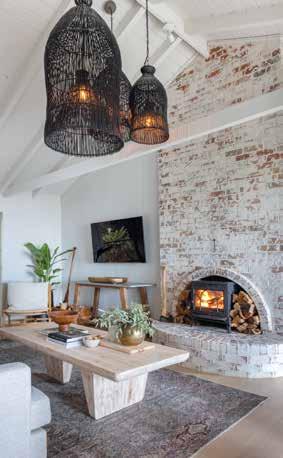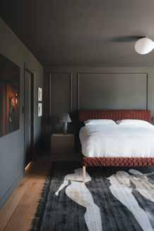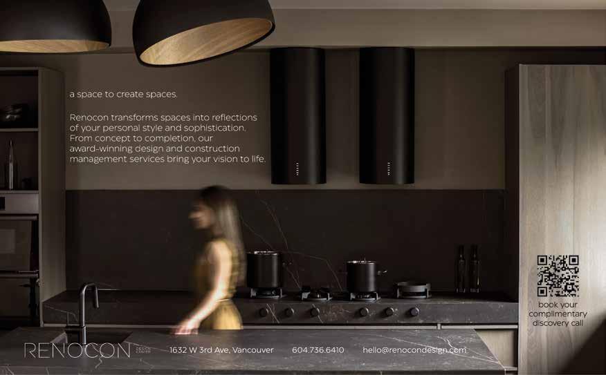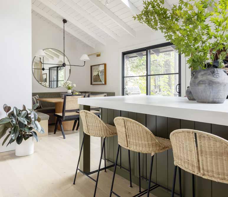 Though this kitchen is in a Whistler home, it takes its inspiration from another mountain town: Tahoe. “It became a high inspiration for this project,” says interior designer Lauren Ritz. “Homes there have this rustic drama, and we just had a great time playing with it.” So while many other Whistler homes feature wood and stone, this one swerves with raw steel detailing and chiselled limestone countertops; cabinets, meanwhile, are made from rustic, pressed-wood veneers finished with a water-based lacquer (shoutout to McGrath Millworks). Cold-rolled steel wraps the hood vent and cascades right down to the stovetop, because, as mountainrugged as this “cabin” kitchen is, it’s still made for modern life. “It’s an easyto-wipe surface that’s going to age well over time,” says Ritz.