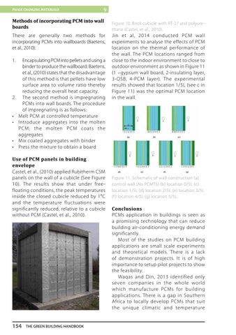 Use of PCM panels in building envelope Castel, et al., (2010) applied Rubitherm CSM panels on the wall of a cubicle (See Figure 10). The results show that under freefloating conditions, the peak temperatures inside the closed cubicle reduced by 1°C and the temperature fluctuations were significantly reduced, relative to a cubicle without PCM (Castel, et al., 2010).