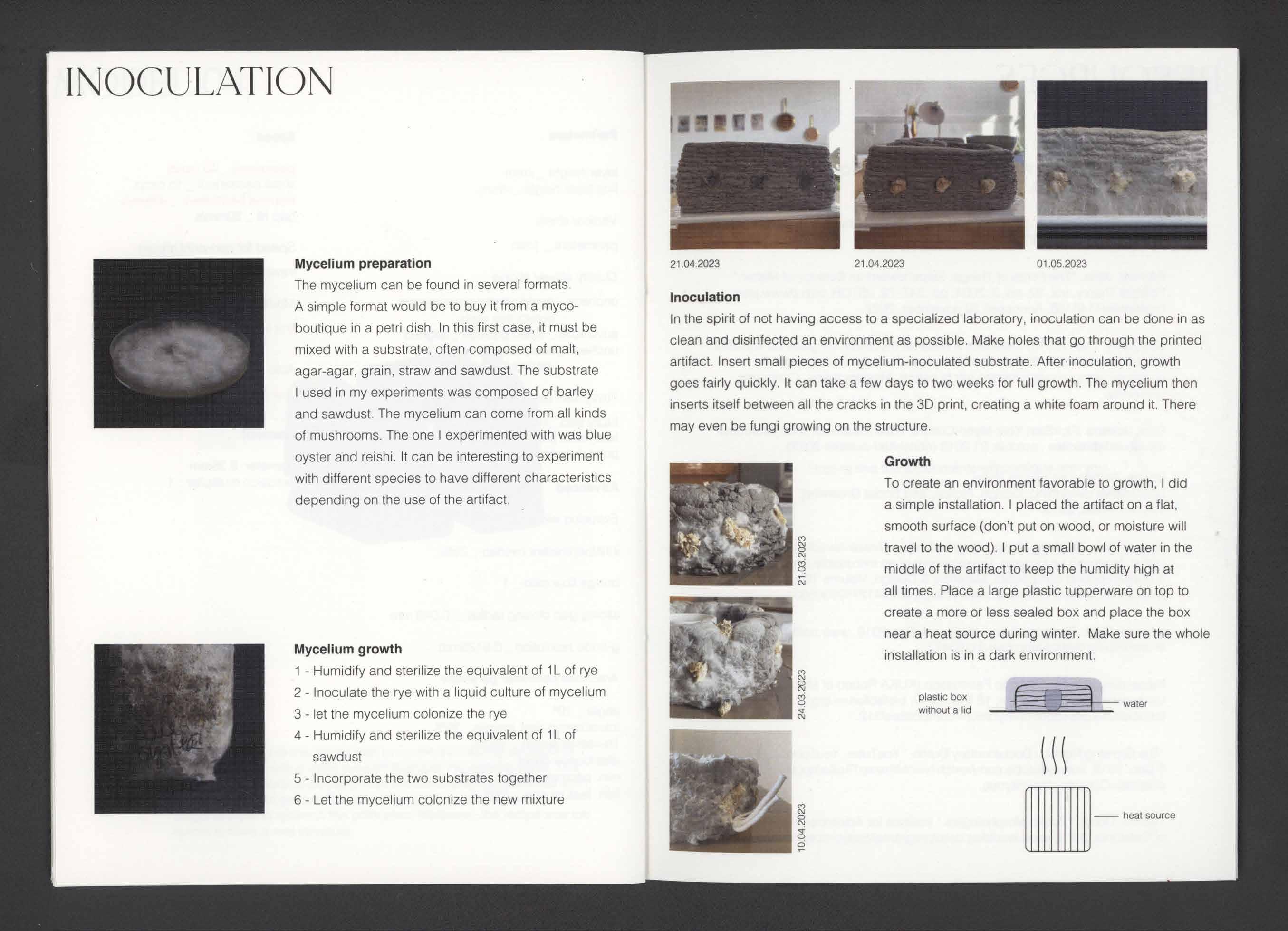 Aiming to build tomorrow's materiality with today's waste, this artefact is centred on the transformation of urban waste as an inoculation substrate for mycelium growth. Creating a bridge between experimentation and academic learning, this guide will hopefully serve as one of the starting points for any future student wishing to embark on a similar research project.