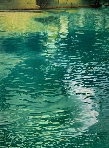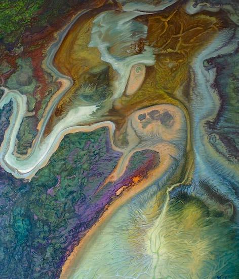 It is worth devoting a bit of time to look at the structurally sound pictorial strategy the artist employs throughout her work. She adroitly translates the essential shapes of trees, rocks and water strams into enigmatic paintings. Veins of color isolate and intensify detached lines and shapes and at the same time, become equivalents for light. Thus, her formal innovation offers us sensations of breathtaking views, vertiginous and strong flows of cascading water currents --- imagery that is simultaneously benign and awesome.