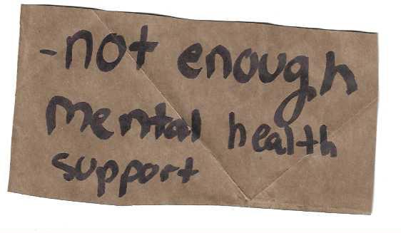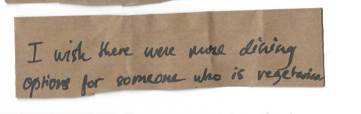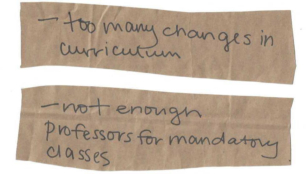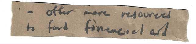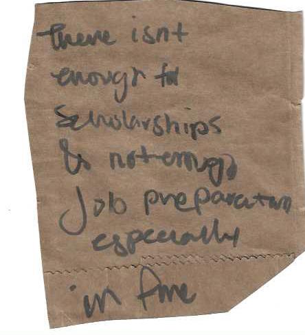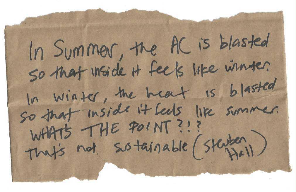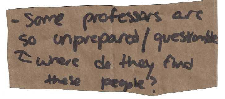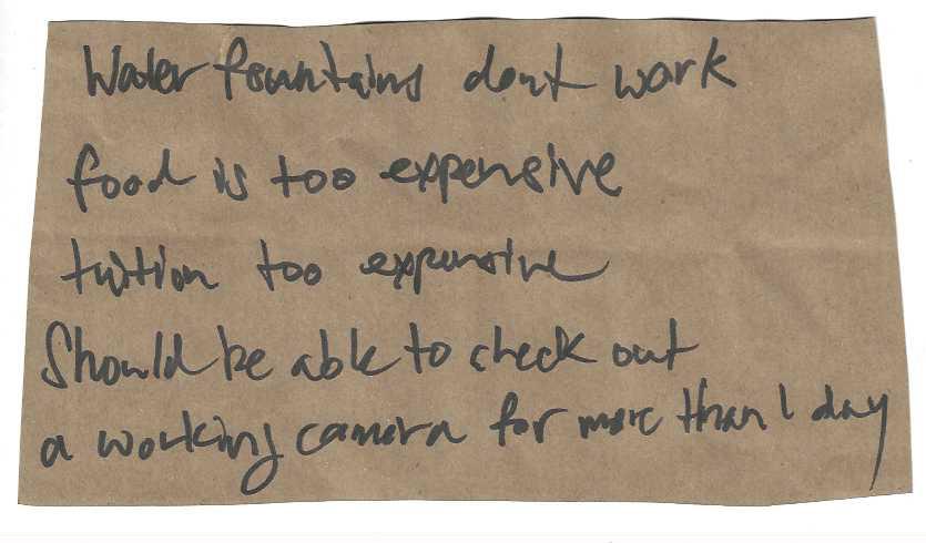 Suzanne: I hate to say it, but it’s kind of like what we’re doing with this project. That’s something I was going to say as well, I felt frustration with this process, because we are hearing all of these things that people are upset about, and we’re wondering what we can do about it. And I went and talked to somebody who’s the head of the Student Union to see if we could leave the grievance sign and the collection box there permanently. And he said no, that he didn’t feel like he was the right person to collect that information. He felt it would be better coming from the student government, fellow students asking for suggestions in a more positive way. He gave me an email from the student government, and I emailed them but I haven’t heard from them.
