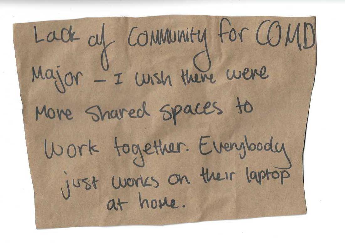 We have a student union, but it’s indoors and people have to make time to go there. Maybe we could say that one of our takeaways is that there should be a community space that is more accessible.
