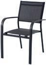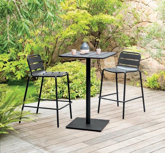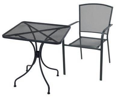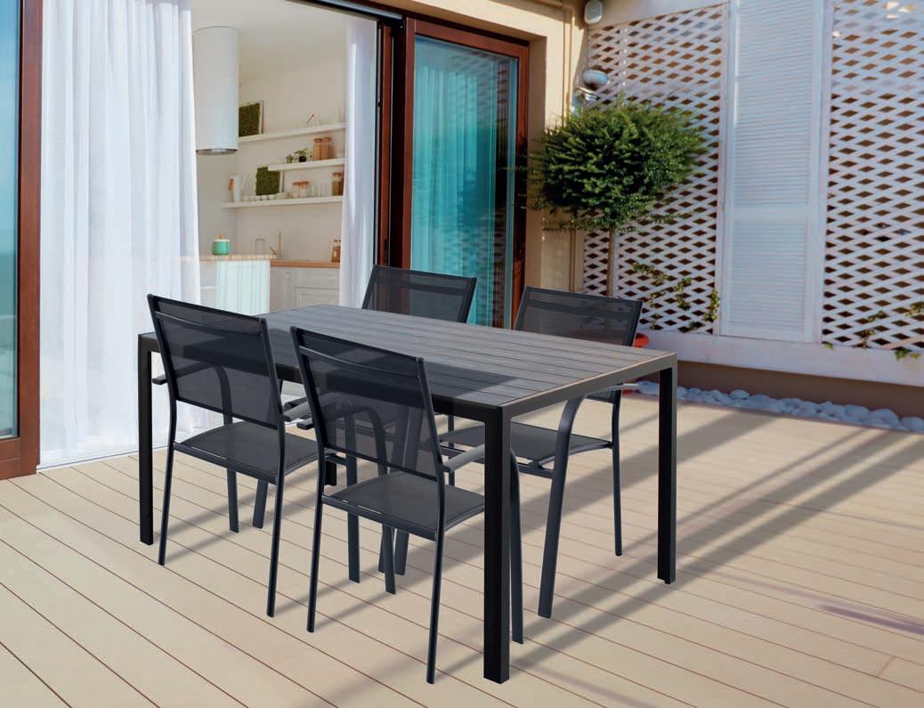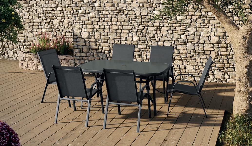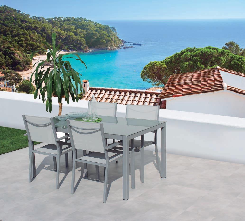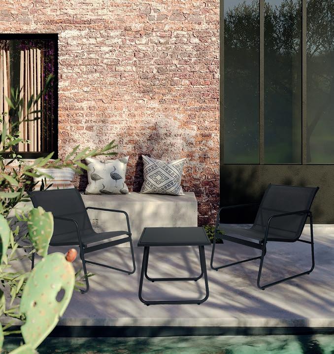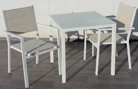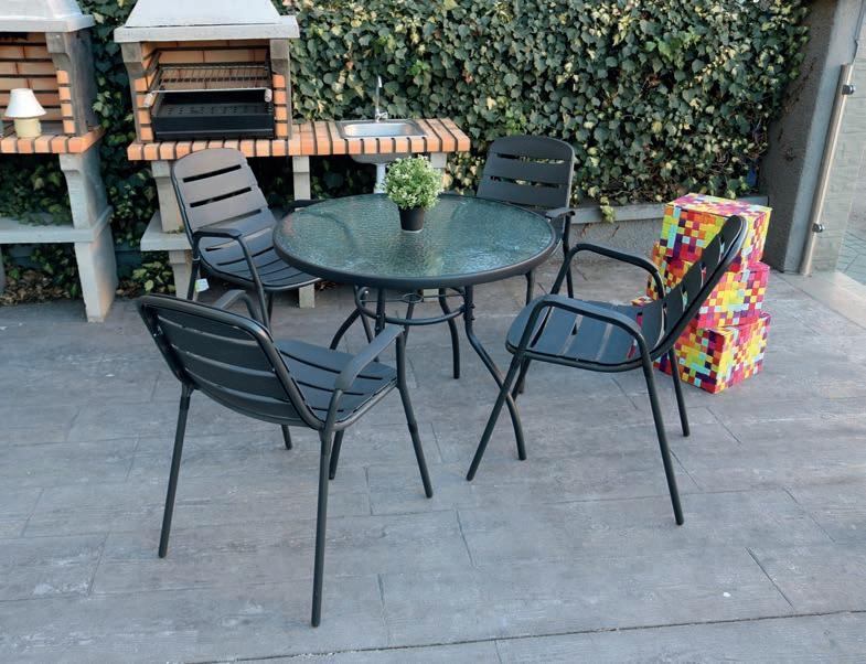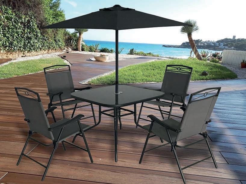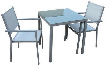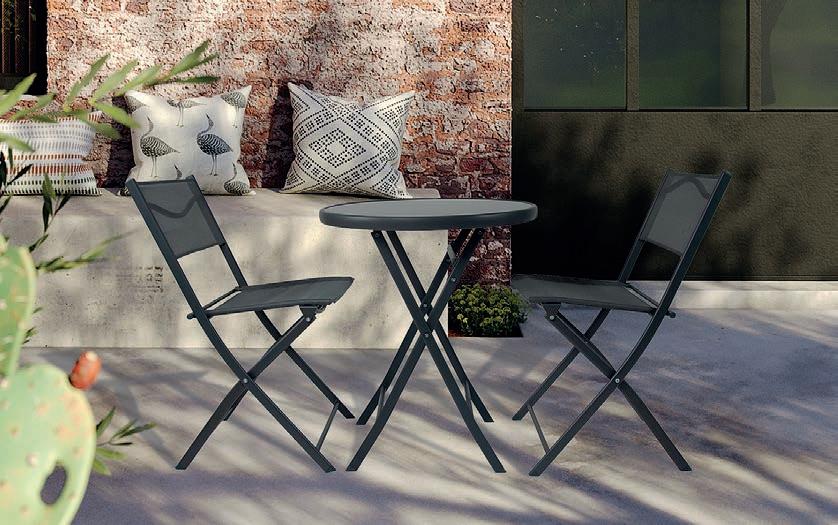 Estructura en acero color gris antracita y textilene. Mesa Ø 60 cm x 70 cm altura con sobre de cristal templado de 5 mm. + 2 sillas plegables