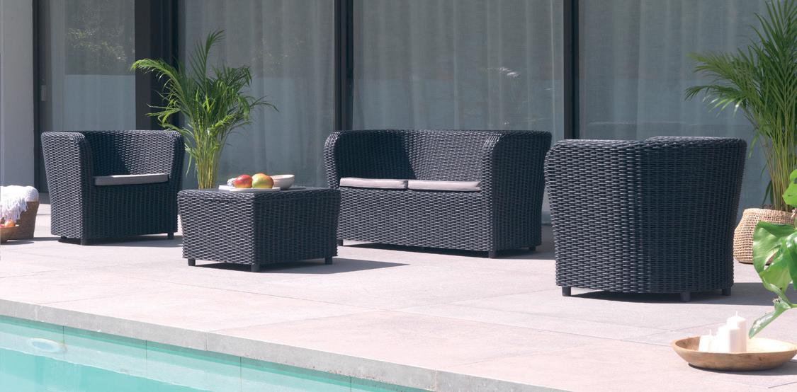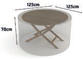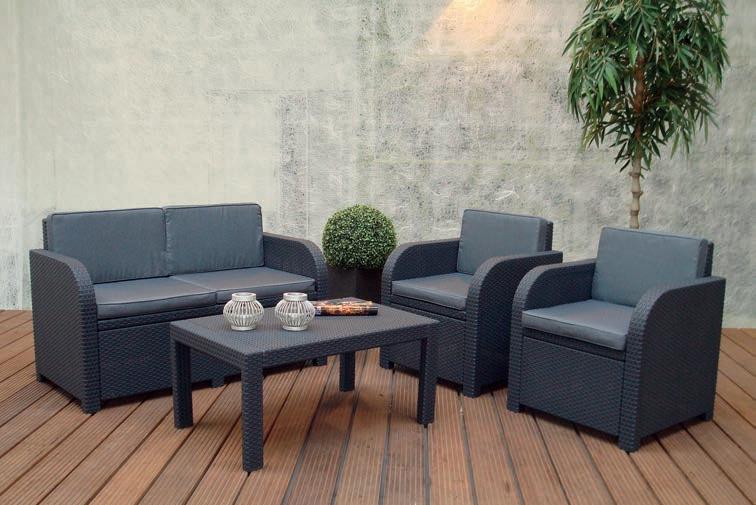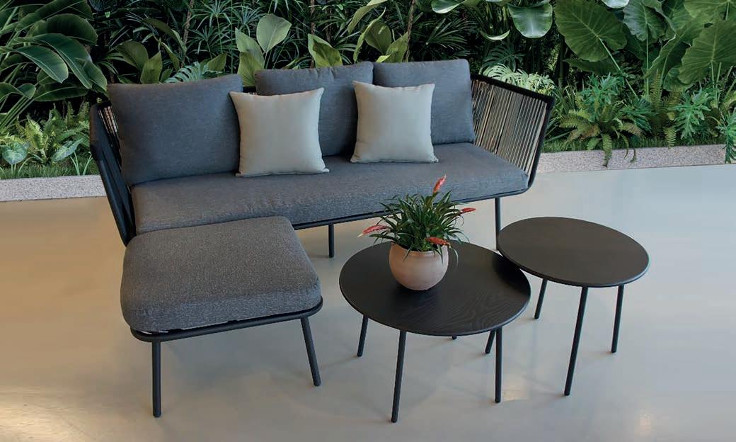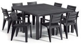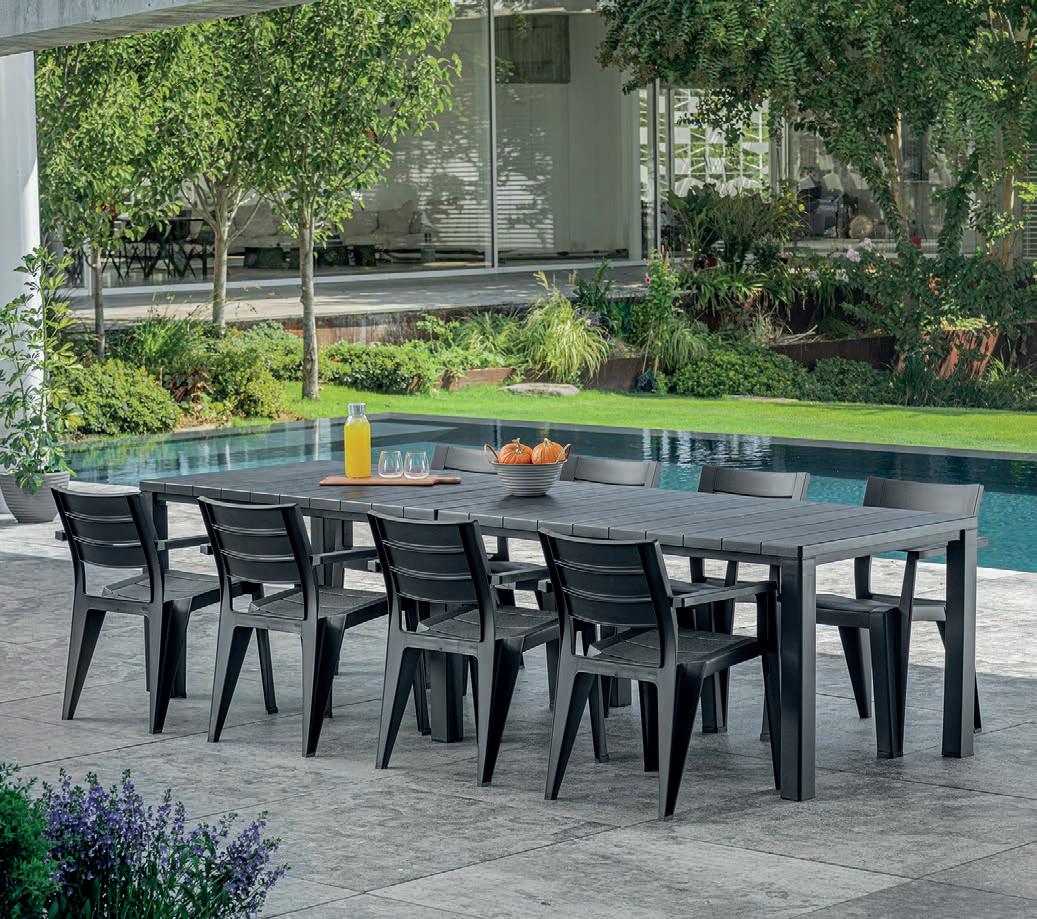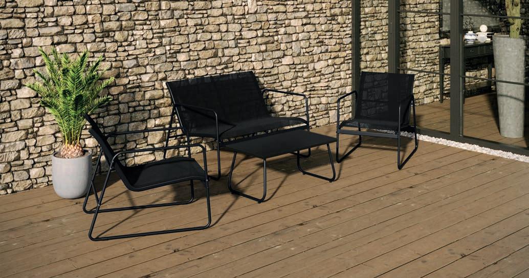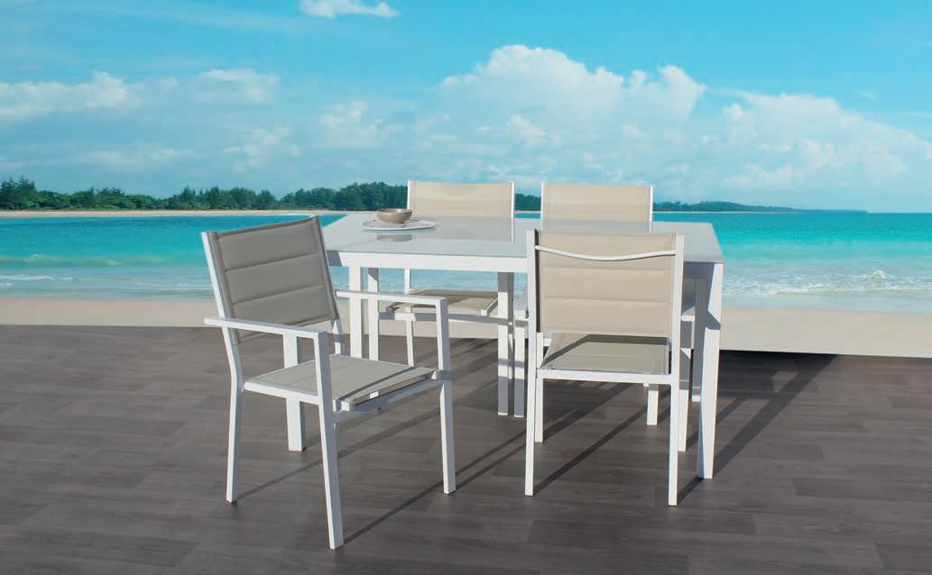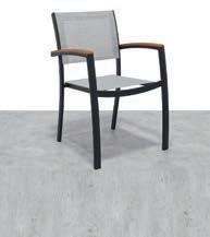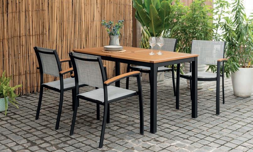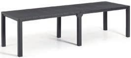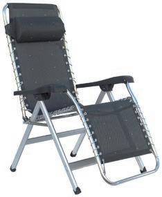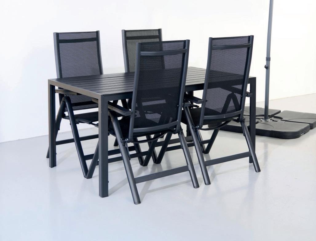 Estructura en acero color gris antracita y textilene. Mesa Ø 60 cm x 70 cm altura con sobre de cristal templado de 5 mm. + 2 sillas plegables