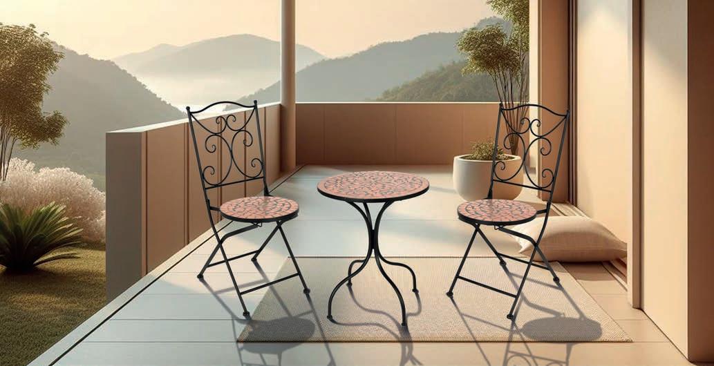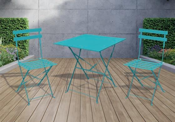 Fabricado en madera de Acacia con estructura metálica. Mesa plegable de 55 x 54 x h71 cm + 2 sillas plegables.