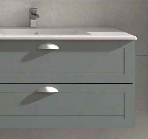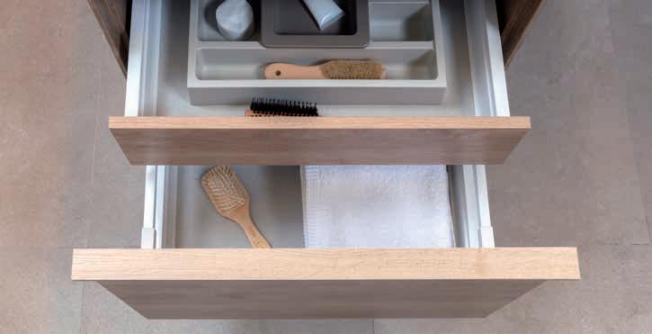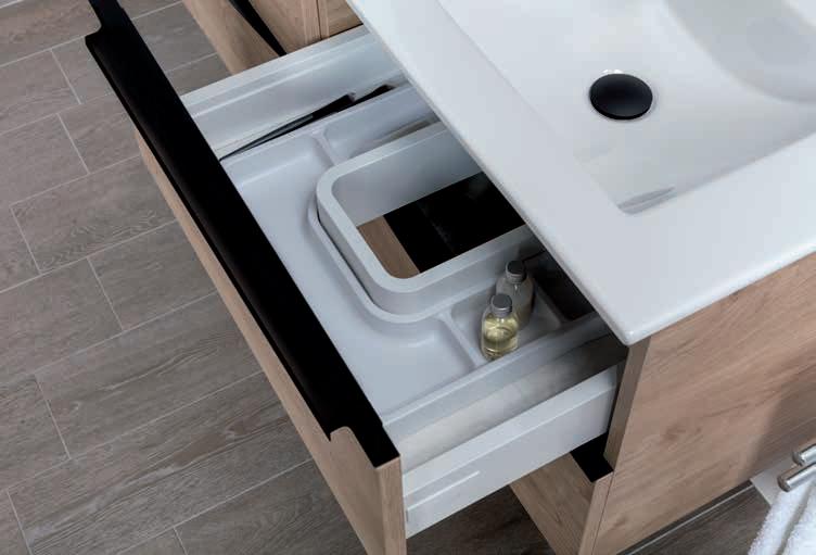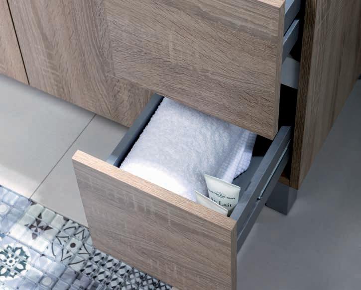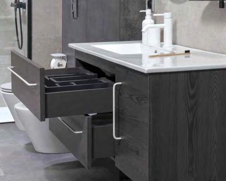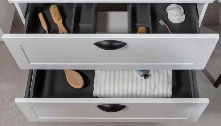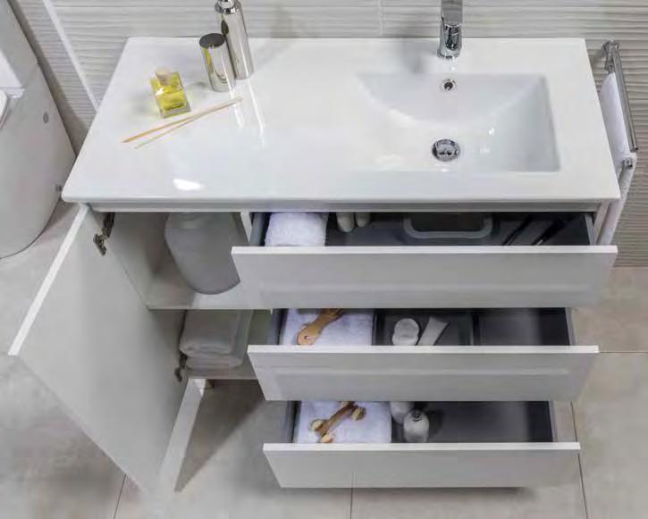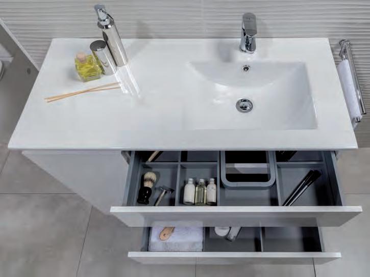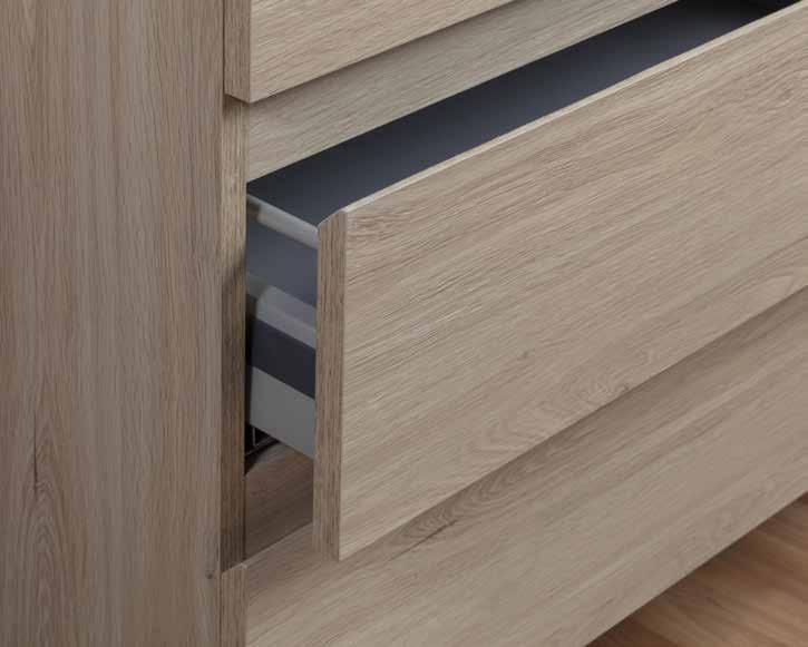 Cajones con guía oculta HETTICH de extracción parcial, con costados de madera de 12 mm. Fondo de los cajones de 8 mm. Cajón superior con la “U” salvasifón. Interior del cajón color gris. Bisagras HETTICH de cierre amortiguado.