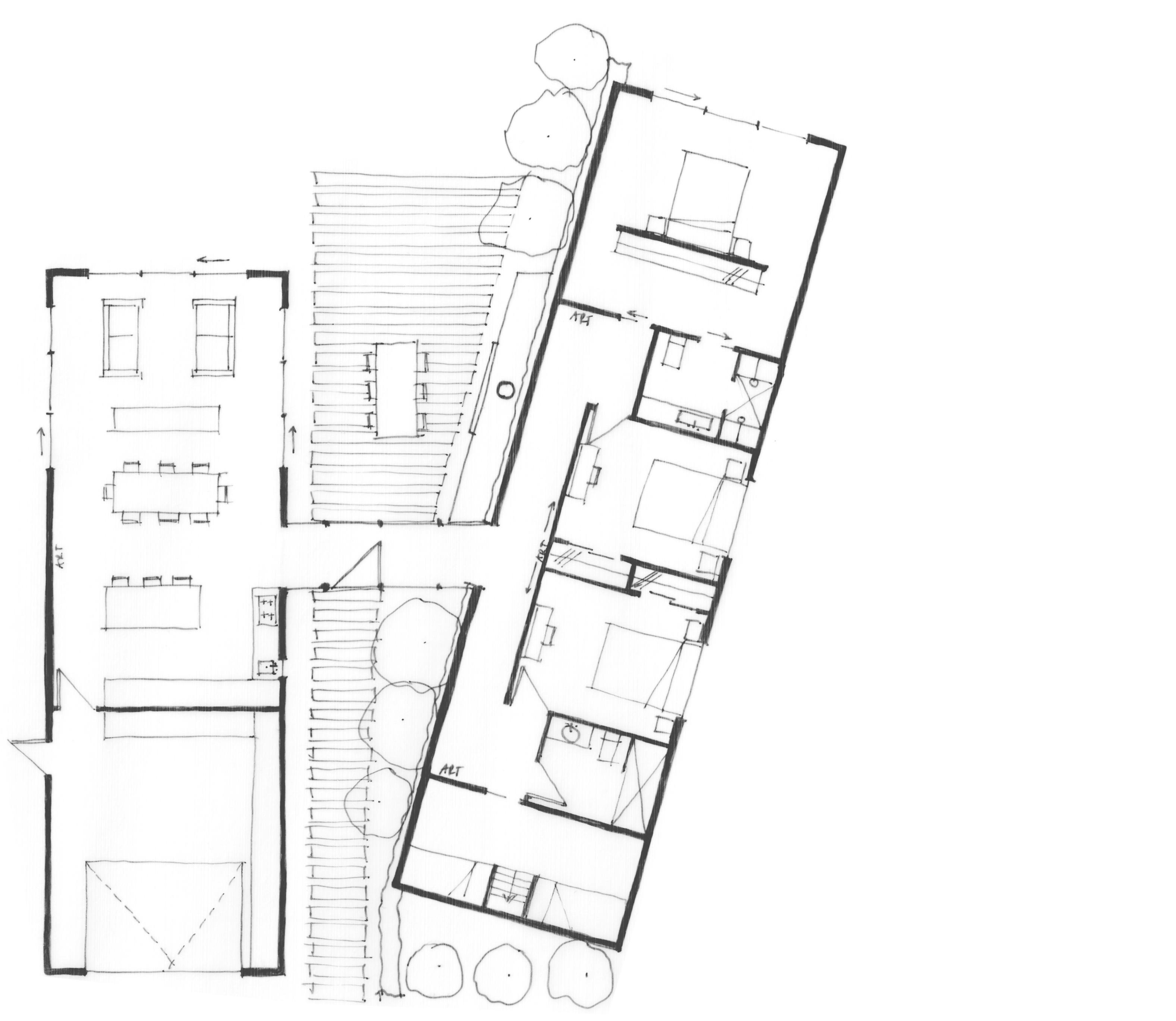 the open-plan connection between dining and lounge. The southern wing contains bedrooms and study spaces, stepping gently with the site and daylight. A master suite occupies the eastern end for privacy and views, while two guest rooms, a shared bathroom, and a flexible bunk/office room complete the wing with layered functionality and future adaptability.