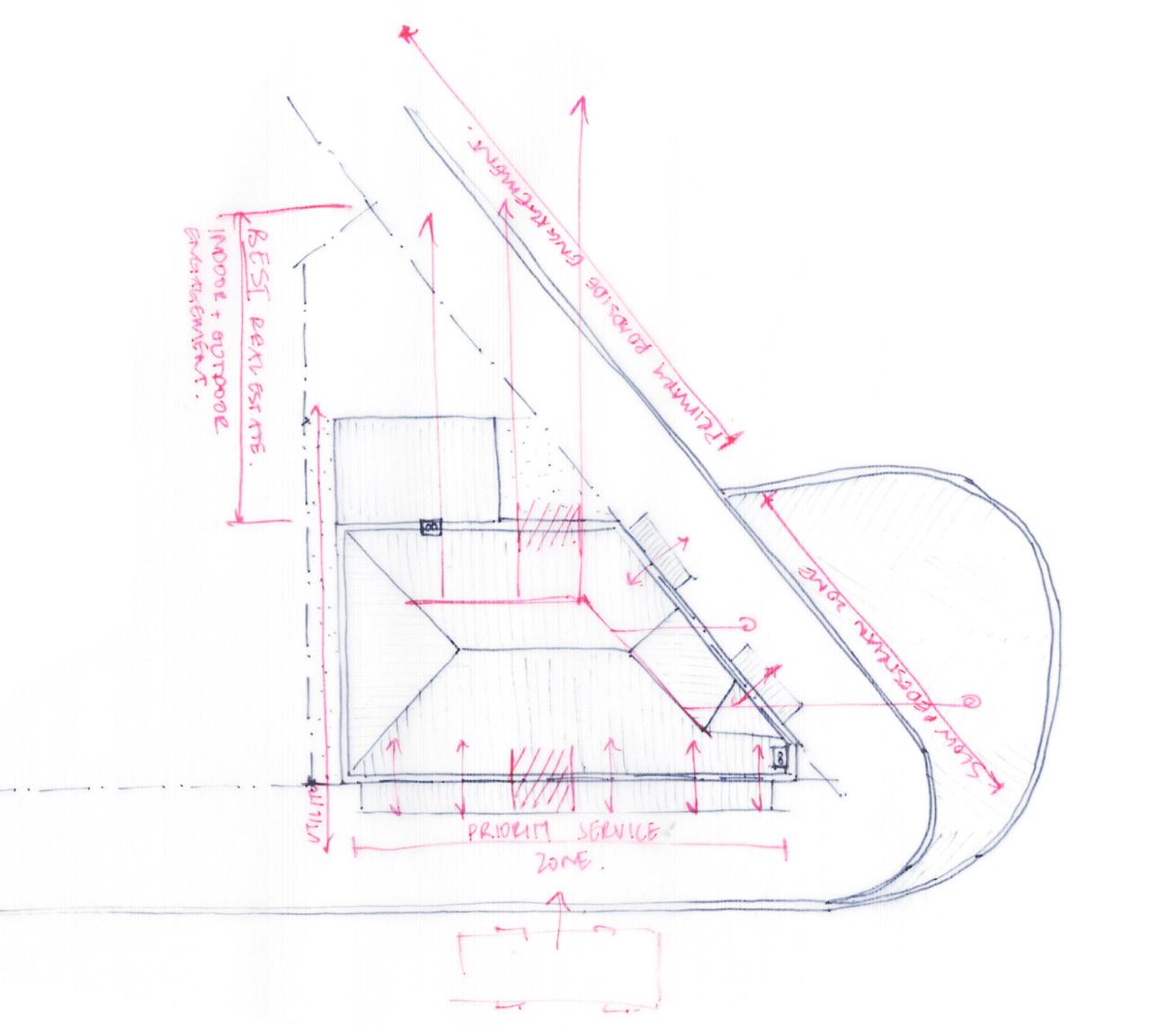 The existing floor plan currently lacks a defined priority street frontage and provides single access from the tributary street rather than the main highway. The prime northeast portion of the site remains underutilised, with kitchen and service areas occupying this valuable space. Conversely, the dining and access areas are situated to the southwest, a layout that ideally should be reversed to maximise sunlight, street presence, and operational efficiency.
