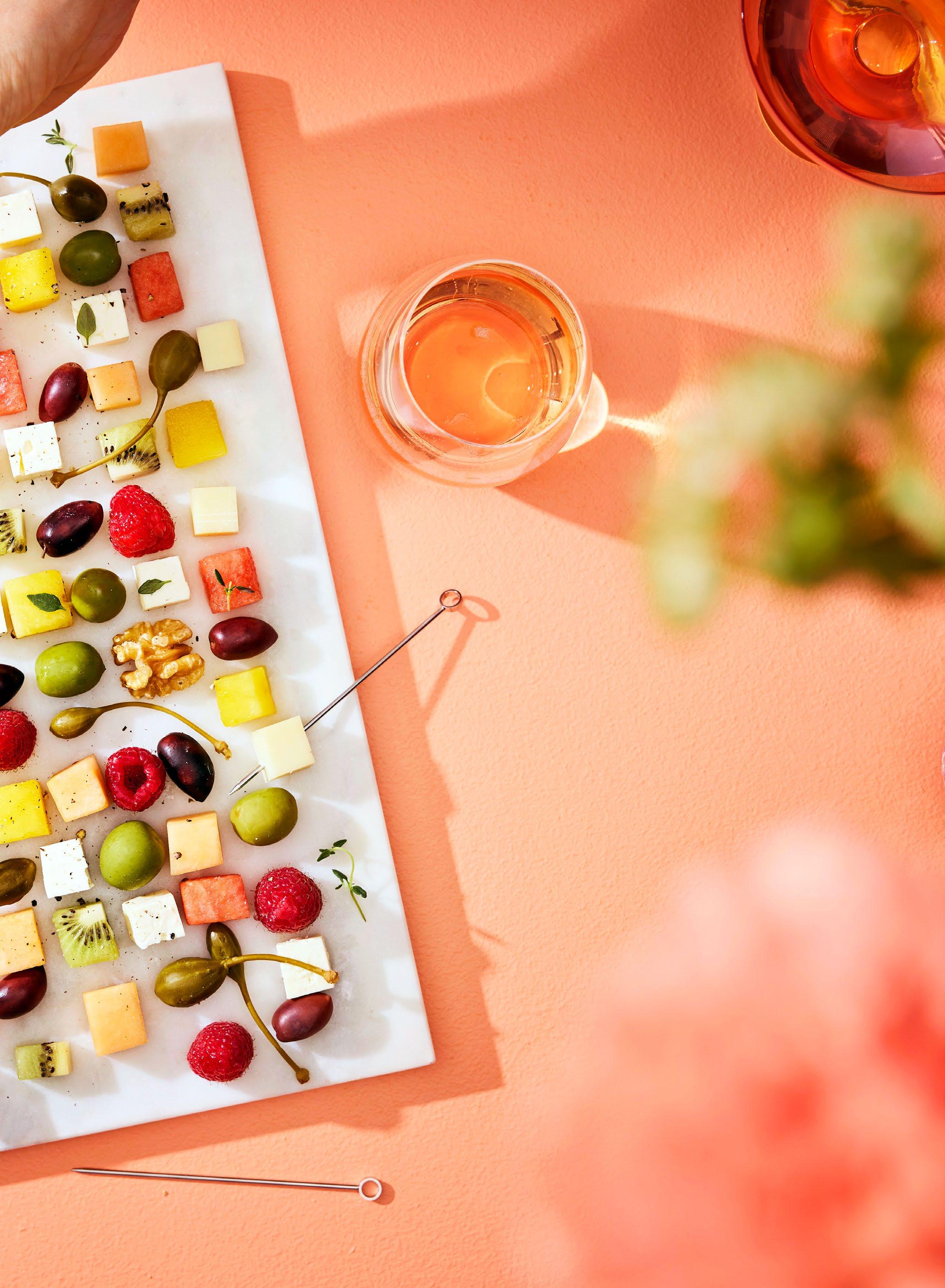 Roseekuohuviini. Juustopelilaudasta napsitaan vuorotellen suolaisia ja makeita paloja. Runsaan hedelmäinen roseecava on täydellisen raikas ja marjainen pari hauskalle herkulle!