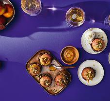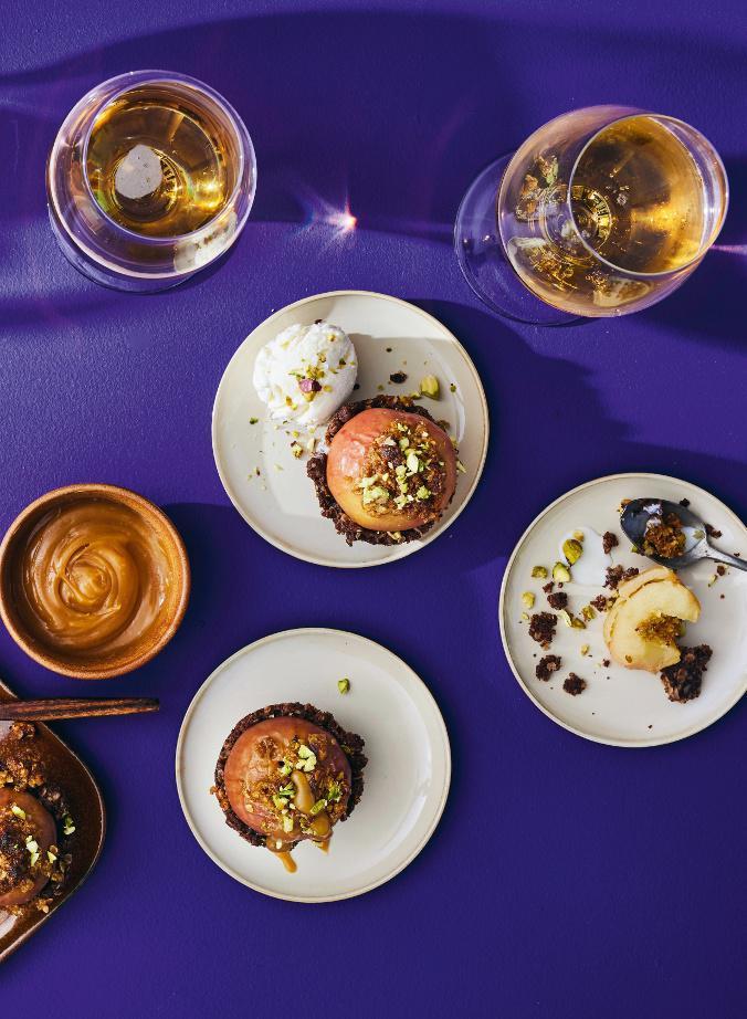 4. Valmista täyte sekoitamalla keskenään fariinisokeri, sulatetu margariini ja rouhitut pistaasipähkinät. Täytä omenoiden kolot.