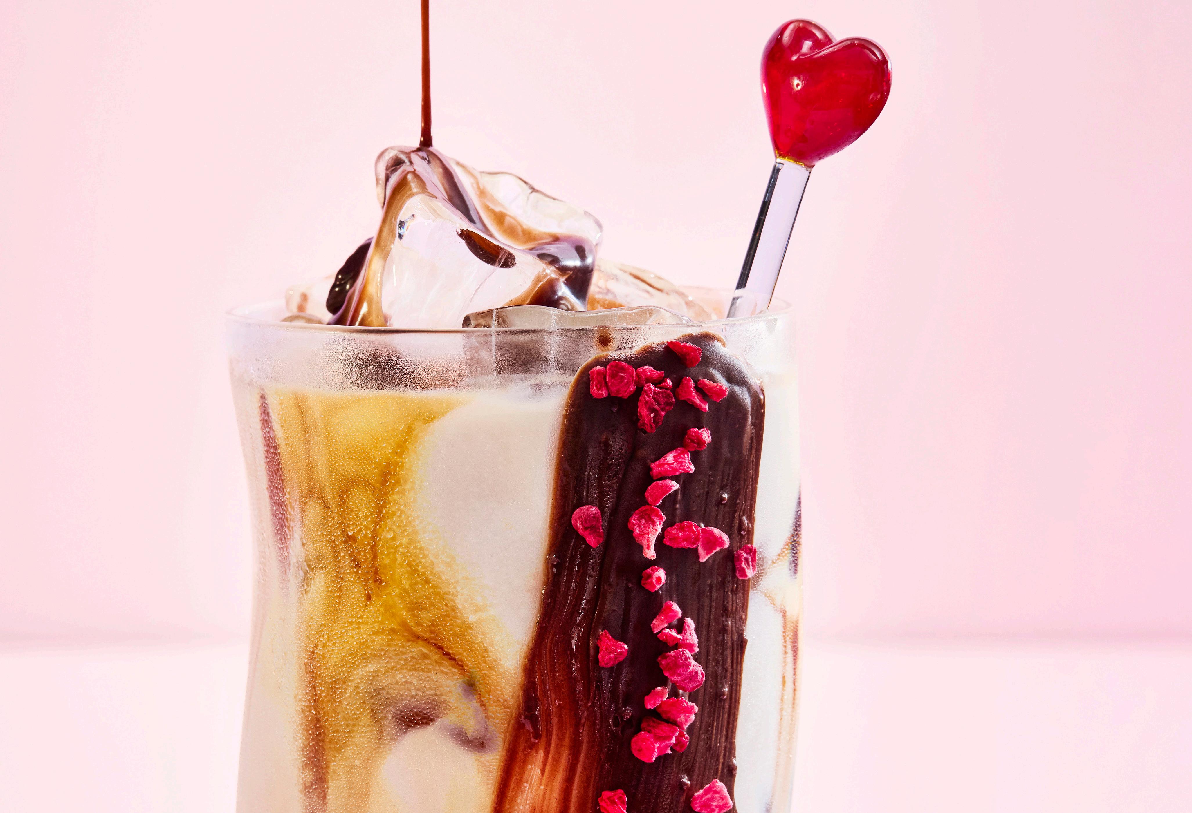 En kall kaffedrink med smak av hallon och choklad. Underbart överdrivet!
