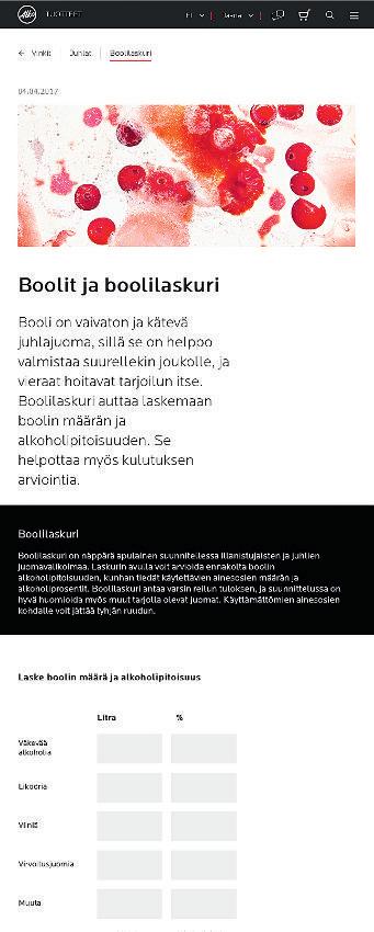 Jo ennen verkkosivu-uudistusta boolilaskuri oli yksi suosituimpia sisältöjä alko.fssä. Nyt samaa sivua rullaamalla löydät laskurin lisäksi neuvot boolin suunnitteluun, juomareseptejä ja muita aihetta käsitteleviä artikkeleita.