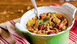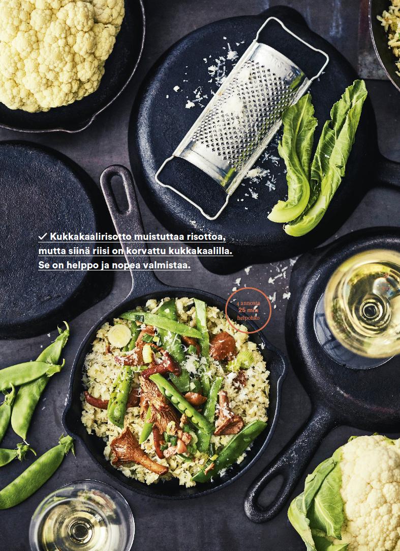Muhevankaalipadanvoitehdä jauhelihasta,muttalihanvoikorvatahärkiksellä,nyhtökaurallatai soijarouheella.Makuatuovatniin kantarellitkuinsuppilovahverotkin. Kaalipadankanssasopiihedelmäinenvalkoviinitaimarjaisatja raikkaatpunaviinit.