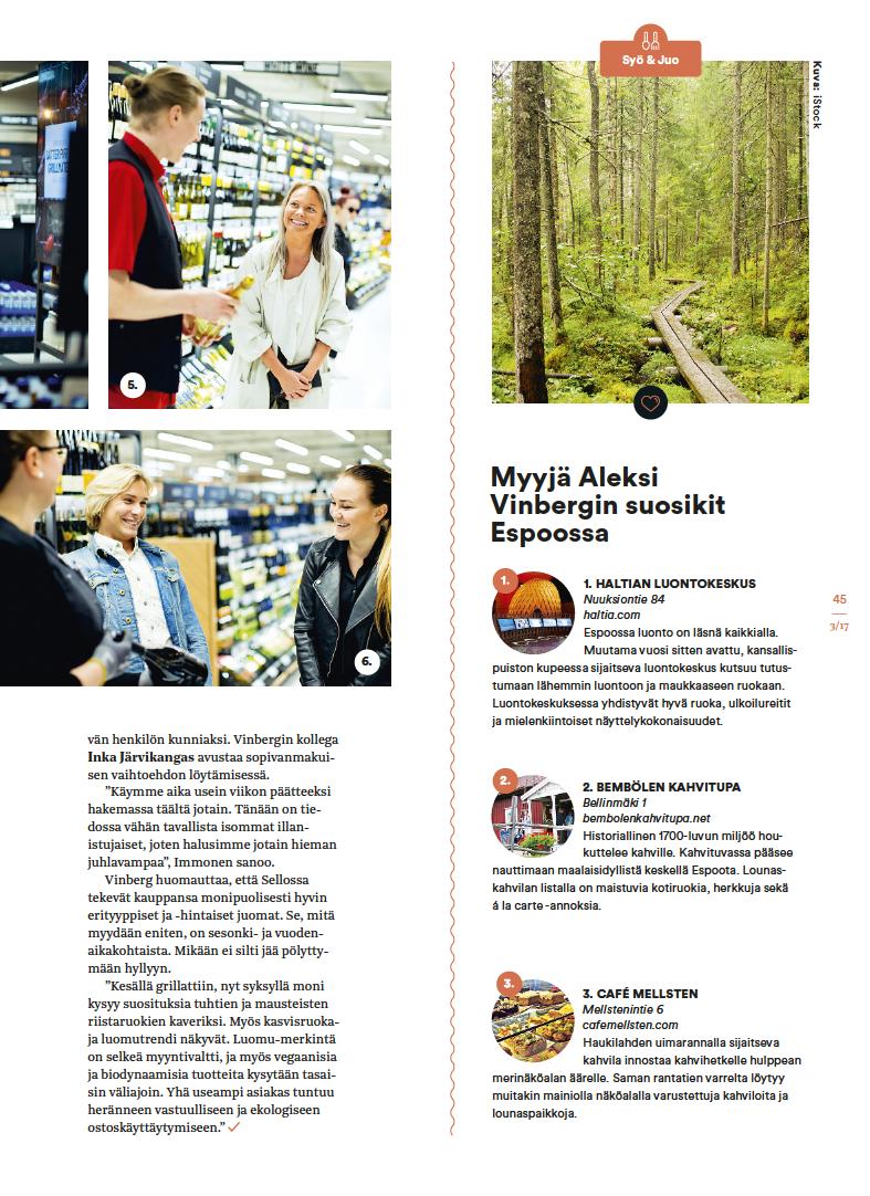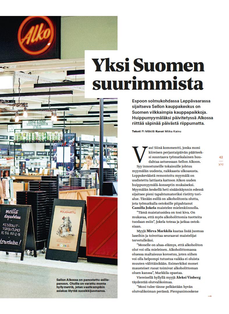 Oluet ovat vain yksi Sellon Alkon monista erikoisuuksista. Vinbergin mukaan myymälän asiakaskunta on todella vaihteleva, joten myös valikoiman täytyy olla laaja. Myynnillisesti Sellon Alko on Suomen suurimpia. Se on helppo uskoa, kun katsoo perjantaina sisään virtaavaa asiakasmäärää. Moni piipahtaa pikaiselle käynnille työmatkan varrella. Niin myös helsinkiläinen Hana Leino Pastrnakova ”Sellon sijainti on tässä erinomainen, ja täällä on kaiken kaikkiaan hyvä valikoima. Myymälä näyttää nyt tilavammalta ja valoisammalta kuin ennen”, hän huikkaa ja kiikuttaa pullon italialaista pinot'a kassalle.