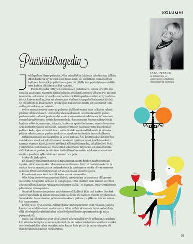 uhlapyhiin liittyy paineita. Niin minullakin. Muistan teinijoulun, jolloin itkin katkeria kyyneleitä, kun rakas äitini oli unohtanut ostaa kinkun kylkeen herneitä, ja pääsiäisen, joka oli pilalla kun perinteinen venäläinen kulitsa oli jäänyt sisältä raa’aksi. Pahin tragedia liittyy ensimmäiseen pääsiäiseen, jonka järjestin itse omassa kodissani. Nuorena äitinä halusin, että kaikki menee oikein. Piti tarkasti noudattaa sukumme ortodoksisia perinteitä. Ostin pashaa varten erityisvalmisteista, kuivaa rahkaa, jota sai ainoastaan Vanhan Kauppahallin juustotädeiltä. Se oli kallista ja kävi nuoren opiskelijan kukkarolle, mutta en suostunut tinkimään piiruakaan perinteistä. Soitin monta neuvoa-antavaa puhelua äidilleni ennen kuin uskalsin ryhtyä pashan valmistukseen. Liotin ohjeiden mukaisesti isoäitini tekemät puiset pashamuotit vedessä, pesin uudet varta vasten ostetut sideharsot 60 asteessa ennen käyttöönottoa, nostin luomuvoin ja -kananmunat huoneenlämpöön ja keräsin sokerin, mausteet, sukaatit, kuivatut appelsiinikuoret, mantelirouheen sekä korintit pieniin kulhoihin. Lopulta vatkasin luomukerman kuohkeaksi peläten koko ajan, että siitä tulee voita. Kaikki sujui mallikkaasti, ja viimein pääsin sekoittamaan pashan tuoksuvat ainekset keskenään isossa kulhossa. Rahkamassaa oli melko paljon, ja se oli paksua. Äiti käytti joskus lihamyllyä saadakseen ainekset sekoittumaan tasaisesti toisiinsa, minä jouduin sekoittamaan massan käsin, ja se oli työlästä. Oli myöhäinen ilta, ja kylässä oli hyvä ystävämme. Kun massa oli mielestäni sekoittunut tarpeeksi, oli aika maistaa sitä. Rakastan pashaa ja otin ison lusikallisen kermaista rahkaseosta suuhuni mutta – jouduin sylkemään sen saman tien pois. Maku oli järkyttävä. En aluksi ymmärtänyt, mitä oli tapahtunut, mutta hetken rauhoituttuani tajusin, että vieras maku rahkamassassa oli suola. Säilytin tuolloin sokerin ja suolan hyvin samanlaisissa lasipurkeissa, ja touhutessa purkit olivat menneet sekaisin. Olin laittanut pashaan 2,5 desiä suolaa sokerin sijasta. Ei auttanut muu kuin heittää koko massa menemään. Olin lyöty. Koko olemassaoloni äitinä, ortodoksina ja leipojana oli kyseenalaistettu. Sitä paitsi kello oli jo niin paljon, ettei mistään enää saanut ostettua edes tavallista kaupan rahkaa poisheitetyn tilalle. Oli vaarana, että viettäisimme pääsiäisen ilman pashaa. Onneksi huumorintajuinen ystävämme oli kylässä. Hän otti kaiken ilon irti suolatragediasta ja kiusaa minua siitä edelleen, melkein 20 vuotta myöhemmin. Sinnikkään huulenheiton ja lämminhenkisen piikittelyn jälkeen hän sai minutkin nauramaan. Erehdys oli hyvä opetus. Juhlapyhien vanhat perinteet ovat rikkaus, ja niitä kannattaa ehdottomasti vaalia mutta liikaa niihin ei kannata ladata odotuksia, sillä silloin juhlavalmisteluista tulee helposti ilotonta puurtamista ja sarja pettymyksiä. Suola- ja sokeriastiat ovat siitä lähtien olleet meillä hyvin erilaiset, ja pashankin saimme tehtyä seuraavana päivänä. Se oli lasten mielestä taivaallista, vaikka se ei ehtinytkään valua muotissa niin kauan kuin pitäisi ja raaka-aineena oli ihan tavallinen kaupan purkkirahka.