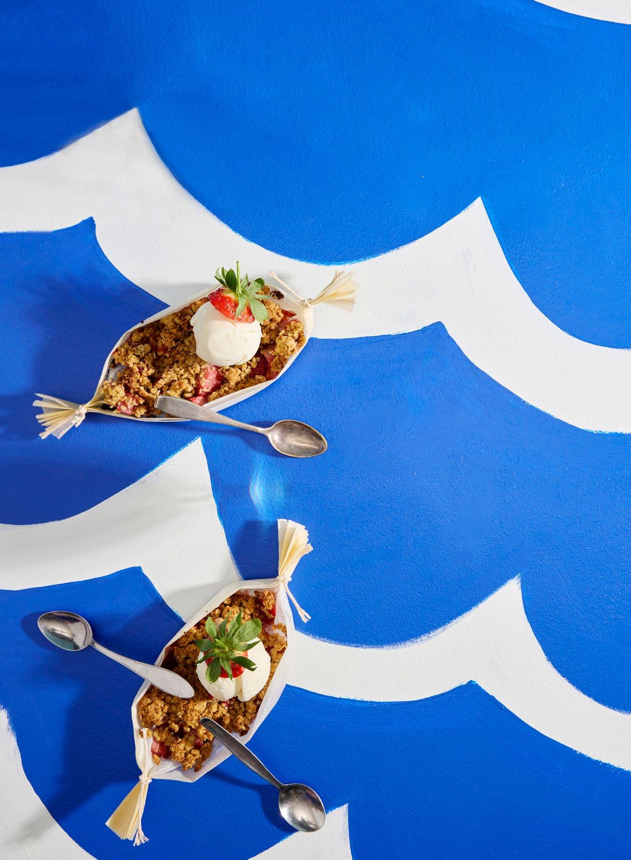 3. Laita raparperipalat ja mansikat veneisiin. Ripottele fariinisokeria ja kardemummaa päälle.