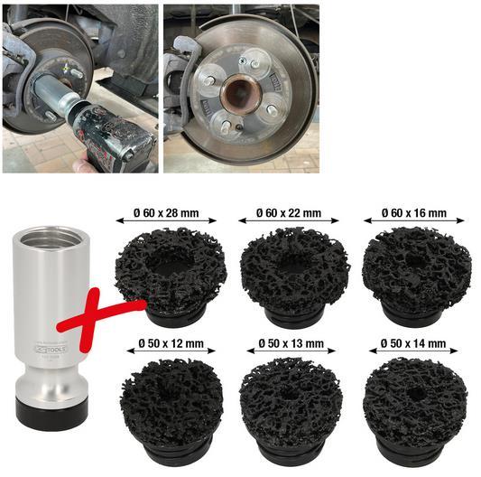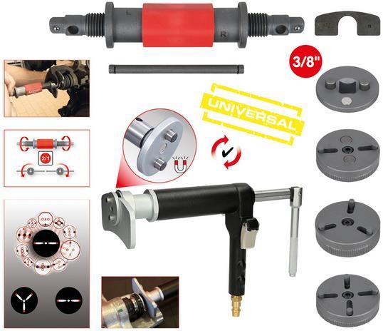 • ainutlaatuiset säädettävät, yleismalliset jarrumännän sovittimet (2-, 3- ja 4-tappiset) ja 3/8 tuuman sovitin, jossa magneetti