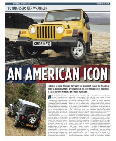AN AMERICAN ICON For fans of all things American, there’s only one genuine off-roader: the Wrangler, a model as iconic as our home-grown Defender. But does the rugged Jeep make sense as a used buy here in the UK? Tom Phillips investigates