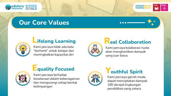 Founded in 2022, 24 January (International Education Day). Edulery Indonesia has given a lot of impacts to the society. There are +800 beneficiaries, +400 students, +30 partnerships, and +15 programs have been achieved during 2022.