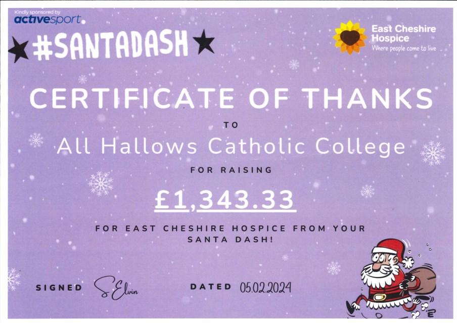 We are once again suppor ng East Cheshire Hospice via the Santa Dash. This will be done in Year 7 and 8 core PE lessons in December. We will have an online Just Giving Page to sponsor students and there will also be paper sponsorship forms available. Students are required to bring in £3 on the day of their run to cover the cost of the Santa hats.