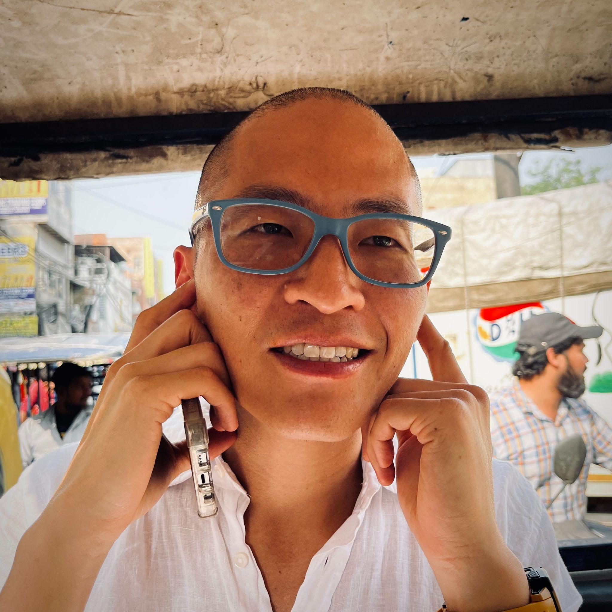 Jon shielding his ears from noisy traffic in Delhi, India.
