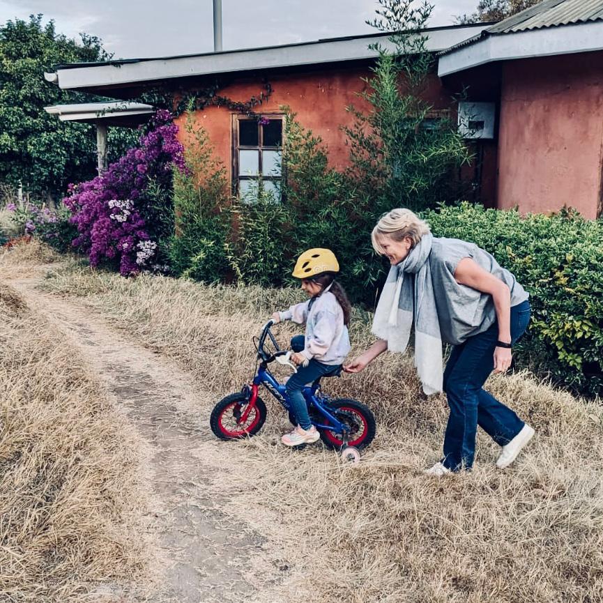 Claudia giving some bicycling support to our friend’s daughter Mia in Kenya earlier this year