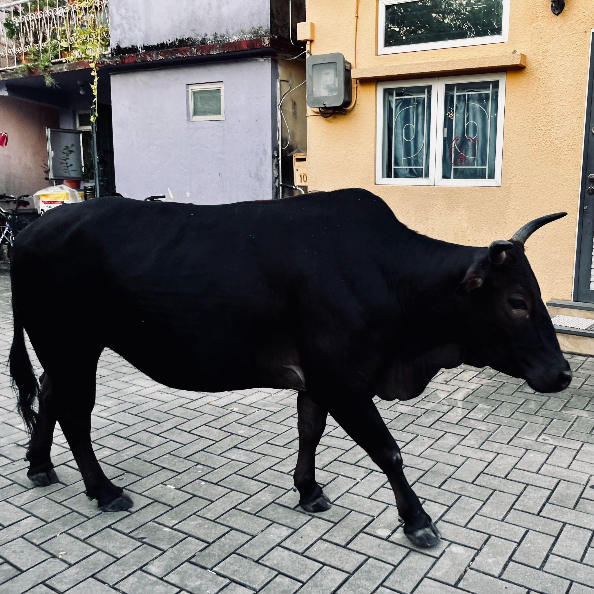 In our village, tame cows and buffalos roam around, as do many stray dogs