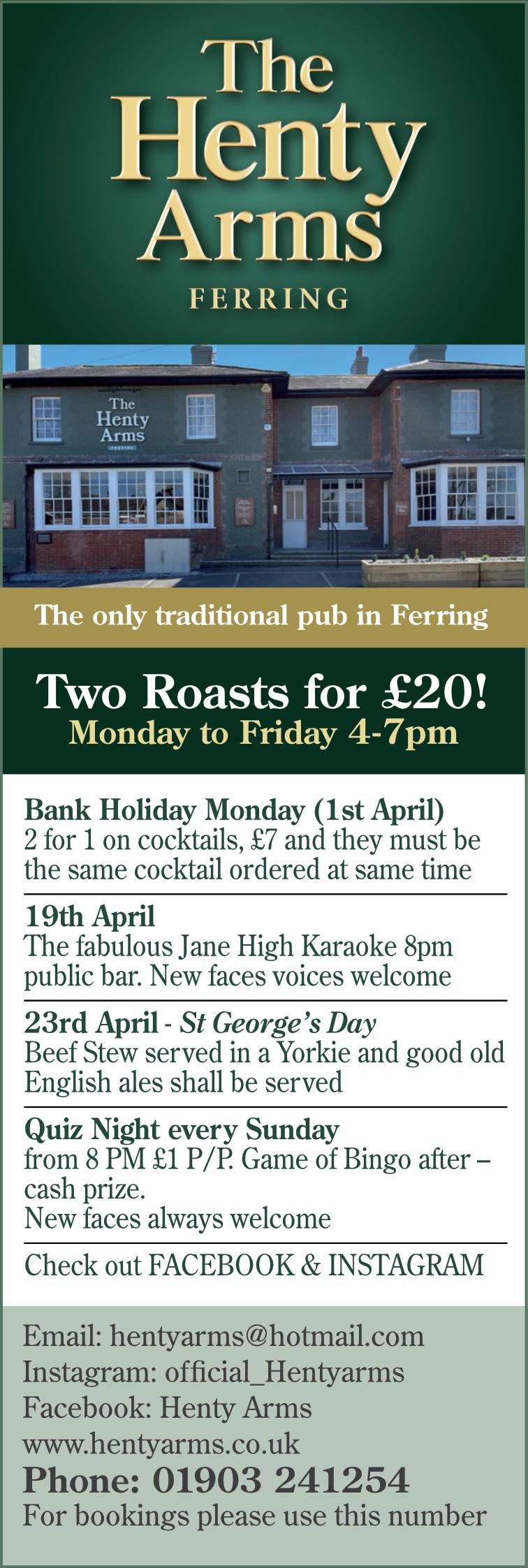 As always, the trustees of the Hall are so grateful for the support shown by the local community and this week, we have three “reasons to be cheerful” as the Blockheads’ song goes. The Orange Tree has kindly agreed to donate 10p from every cup of coffee sold during April to our Call for the Wall. This is the appeal to raise money for a new wall around the hall. And Ferring Parish Council has donated £20,000 towards the £65,000 total cost of the project. That means with other offerings, we are just over halfway there. You can s ll do your bit by making a dona on big or small, just go to our website for more info. Finally, once again, many thanks to the local La n jazz band Serenata who will be performing the first of four concerts on Saturday April 6th, with profits going to the new wall fund.