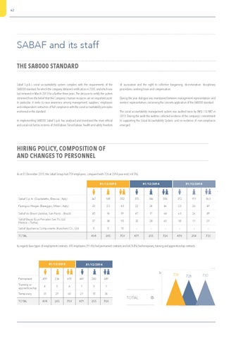HIRING POLICY, COMPOSITION OF AND CHANGES TO PERSONNEL As at 31 December 2015, the Sabaf Group had 759 employees, compared with 726 at 2014 year-end (+4.5%). 31/12/2015