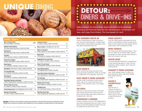 Disclaimer: The CVB has made every effort to verify the dining information in this guide. Please note that some information may have changed since this brochure was published. Check VisitAlton.com for more information and complete listings of all area restaurants.