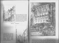 Bush House, Strand is a pencil drawing that was created in 1930-31 and captures the church of St. Mary and the American edifice, Bush House.65 The drawing’s vantage point is from the pavement as indicated in the plan and looks towards Bush House toward the left of the composition. The curved pavement and road occupy the centre of the composition with St. Clements Danes Church in the background as the focal point and the church of St. Mary on the right of the page. People and cars that reflect the time fill the centre of the composition and clouds are lightly suggested above between the two buildings on either side. There is a notable difference between light and dark within this drawing that is articulated through heavy lines, visible on the elevation of the church of St. Mary and the colonnades of Bush House, against light lines, as opposed to shading like S.R.J’s rendition of the Church of St. Michael in chapter one. The scale of the colonnades in relation to the simple gestures of people directly in front ignites the imagination of how people might have transitioned from the street across or into the building.