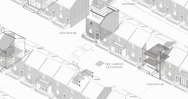 C. The garden extension is a continuation of structural beams that run from the inside of the single terraced house to the gardens that can form either; private gardens, a terrace for the first floor, or an additional first floor room. The fireplace has been converted into a lightpipe for each dwelling, allowing for light to be distributed into the dark interiors.. This will be explored further within the Technical studies submission in July.
