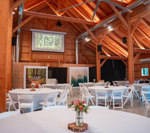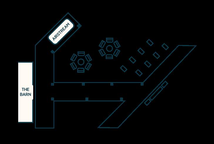 The Barn can seat over 500 people. The building has private bathrooms, a portable stage, in-built mood lighting and can be set up with full AV. It overlooks the lake and outside lies picnic tables, solo stoves, and fairy lights.