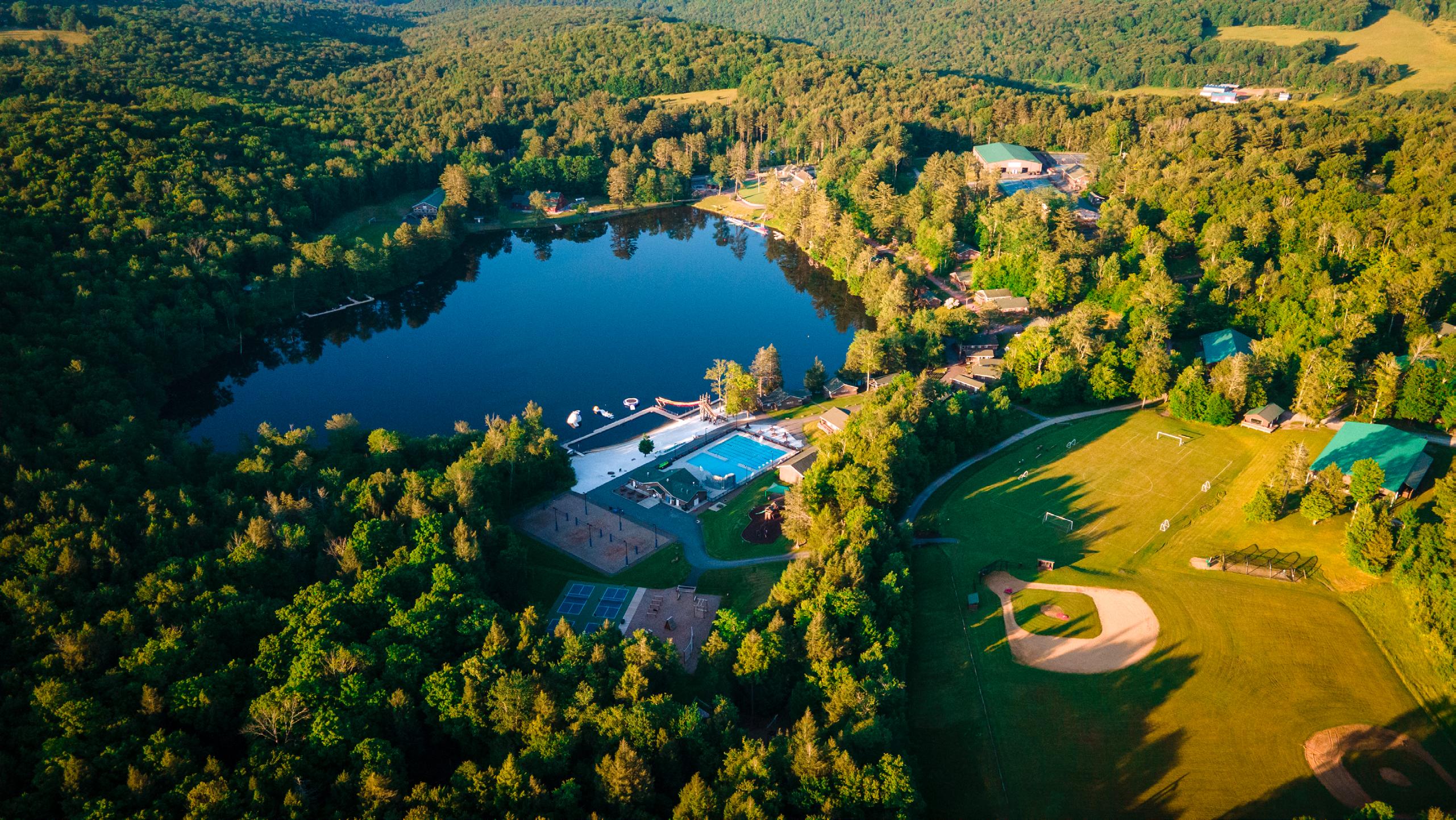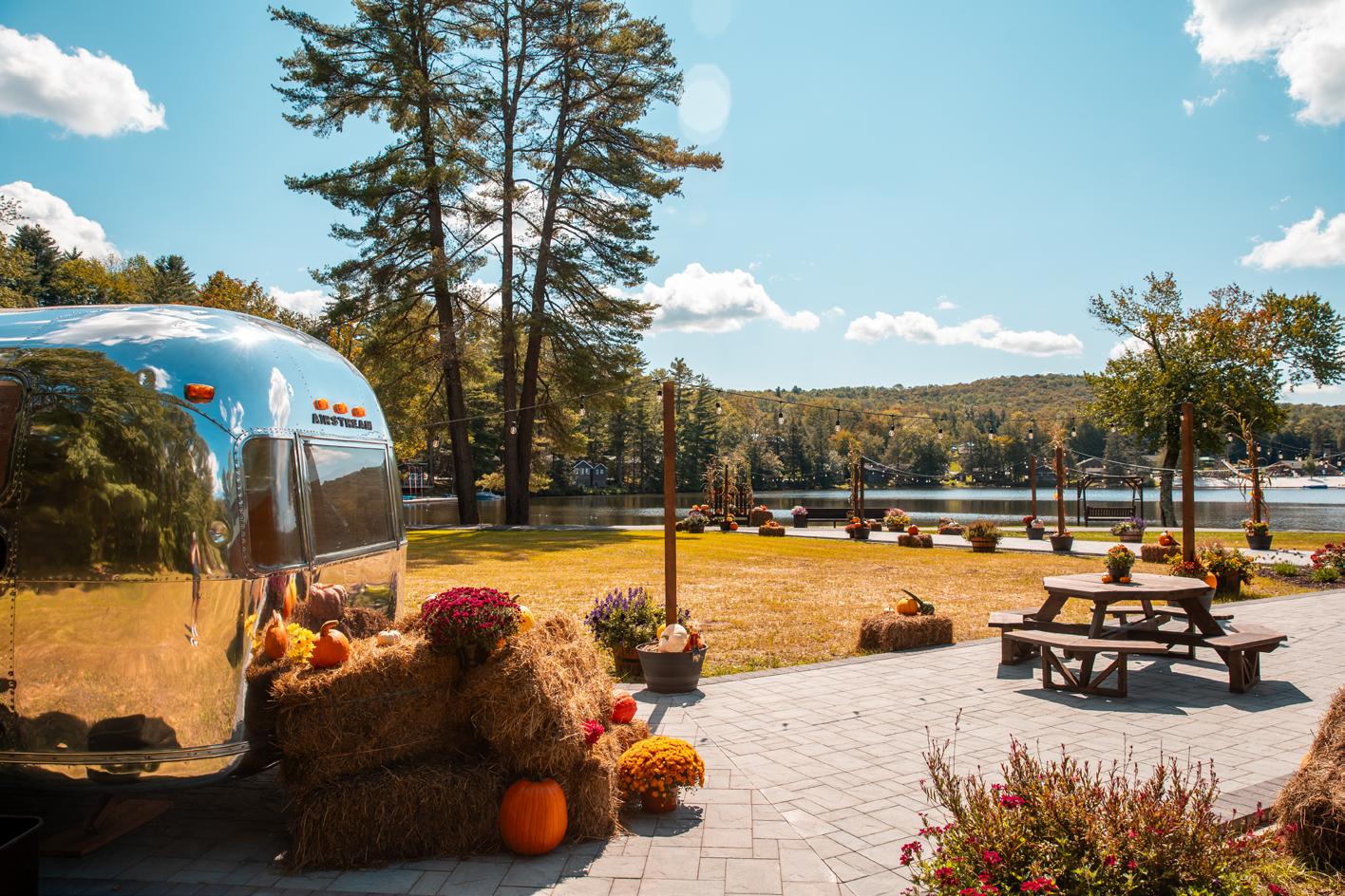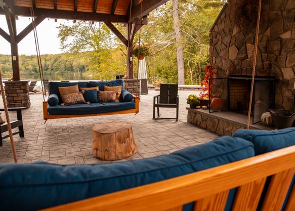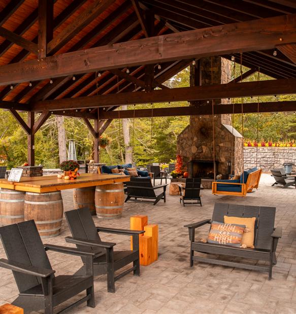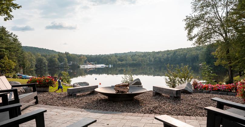 The Pavilion is our outdoor social space in front of the Lodge. It overlooks the lake and has a central fireplace, firepits, bar and swing chairs. It’s the perfect location for a sunset cocktail hour or a late-night s’more bar.