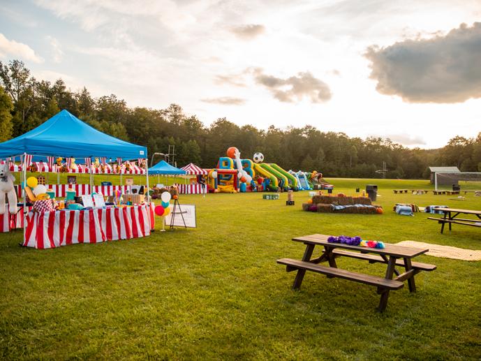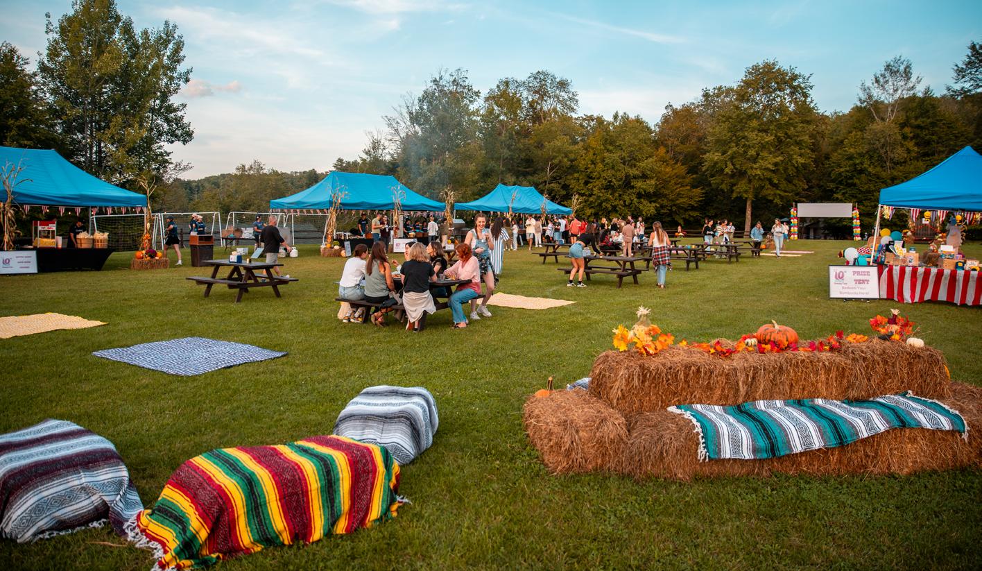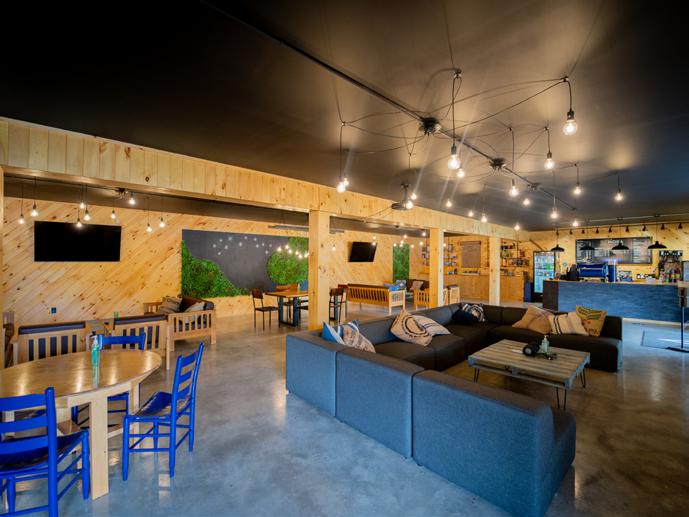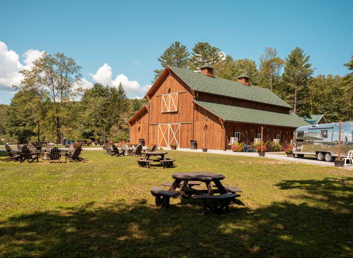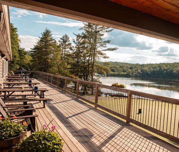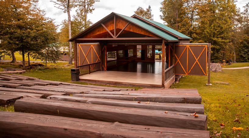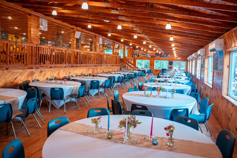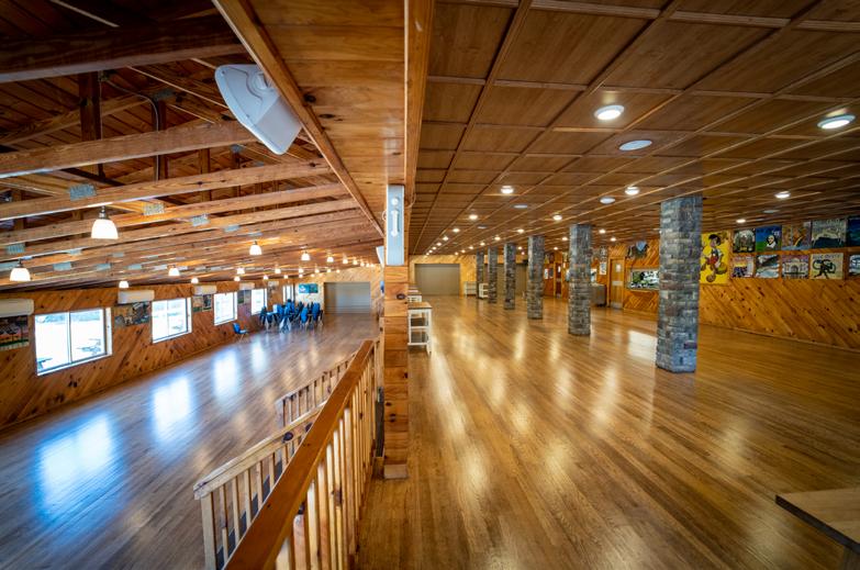 The Lodge is the main dining room where we can seat up to 400 people. With a coffee bar, full-service bar and lounge space, it’s a versatile building. The outdoor balcony provides additional seating and overlooks our flagpole area with artificial grass and lawn games.