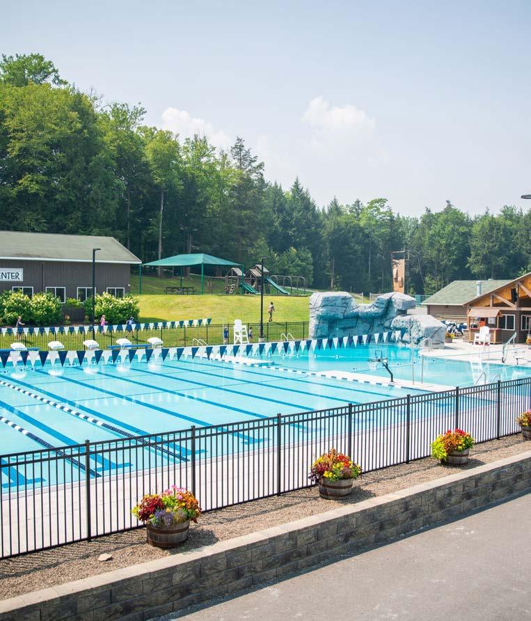 Our pool area has an 8 lane heated pool, rock climbing wall, volleyball net, sunlounging area with additional shaded seating and an outdoor Tiki bar.
