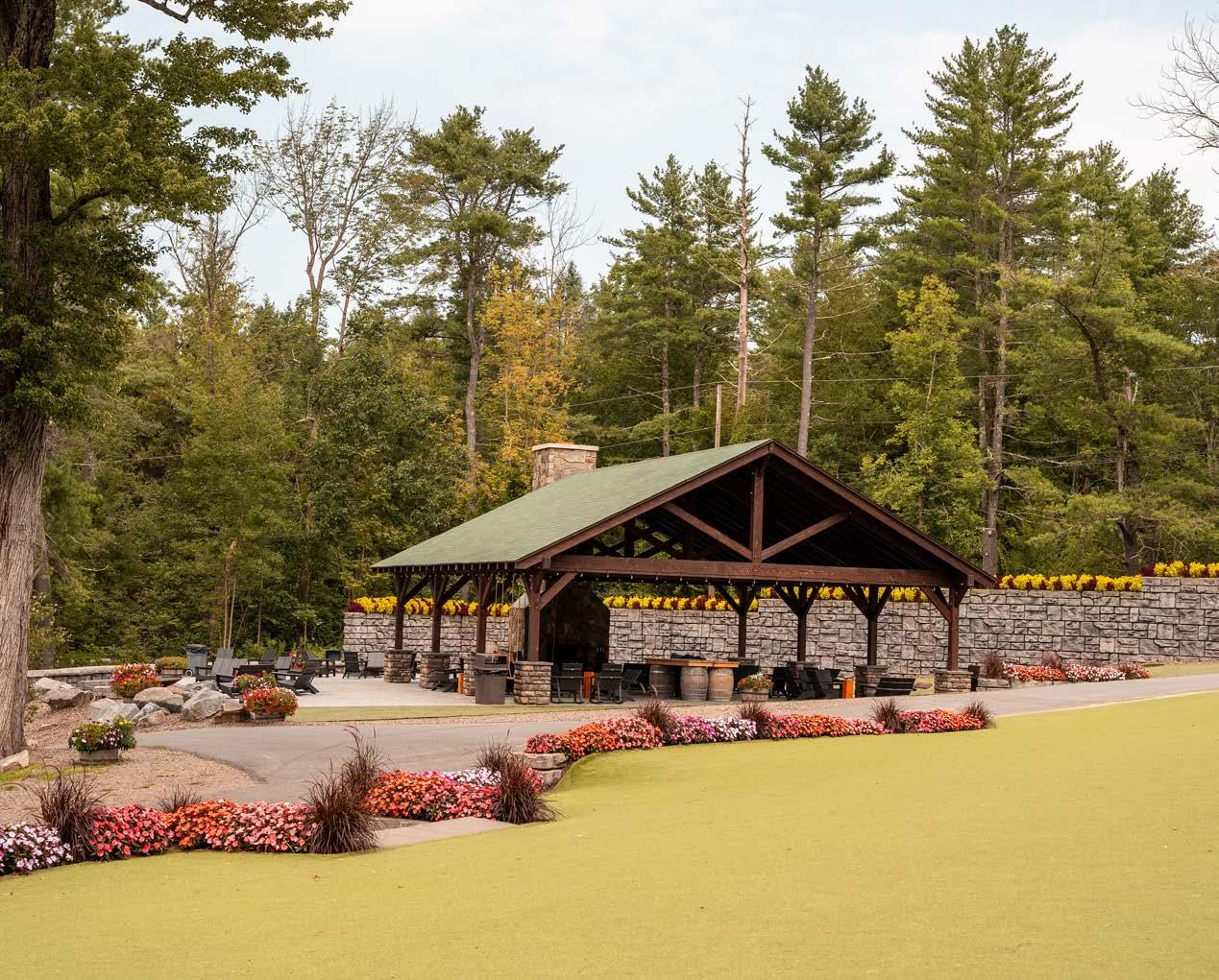 The Pavilion is our outdoor social space in front of the Lodge. It overlooks the lake and has a central fireplace, firepits, bar and swing chairs. It’s where people meet at night to make s’mores and chat when they need a break from the party.