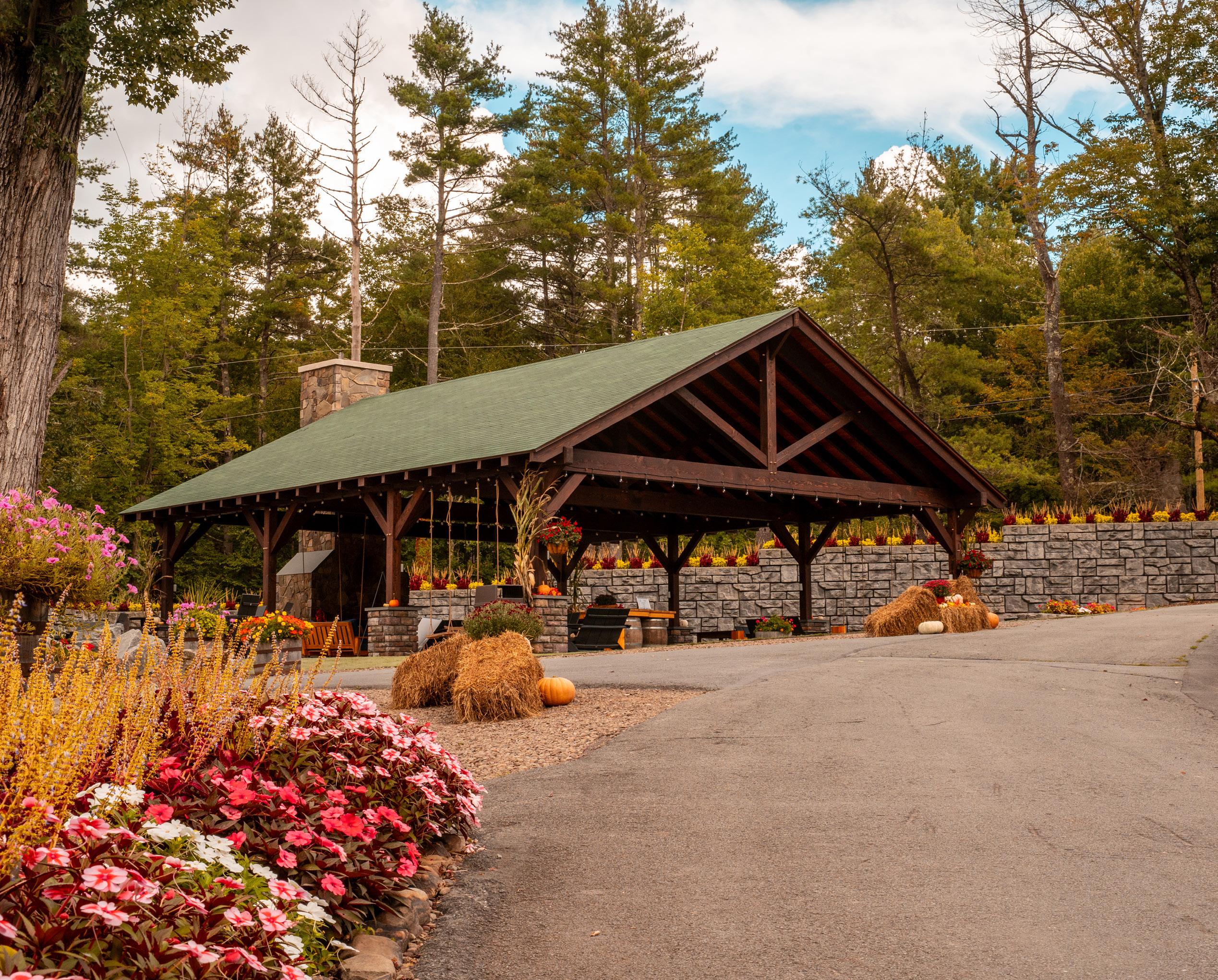 The Pavilion is our outdoor social space in front of the Lodge. It overlooks the lake and has a central fireplace, firepits, bar and swing chairs. It’s where people meet at night to make s’mores and chat when they need a break from the party.