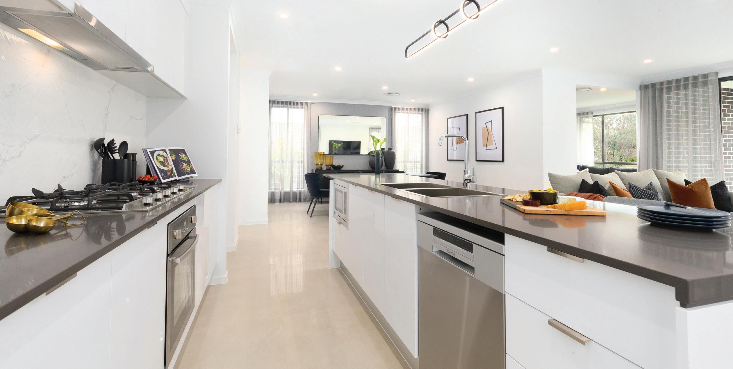 20mm engineered quartz benchtop to island bench and cooktop run of kitchen in colours from builder’s range