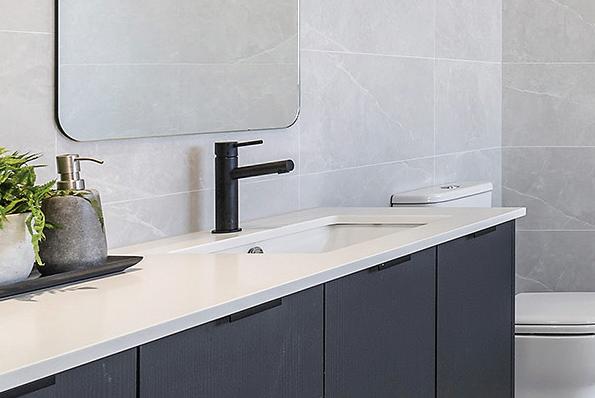 Upgrade to 20mm Caesarstone® engineered quartz stone top to vanities with single porcelain bowl from the builder’s range to ensuite bathroom and main bathroom. The stone top colour to match the kitchen benchtop.