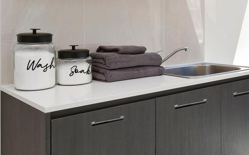 Upgrade 1500mm long laundry unit with laminate top and stainless steel drop-in tub with overflow from builder’s range.
