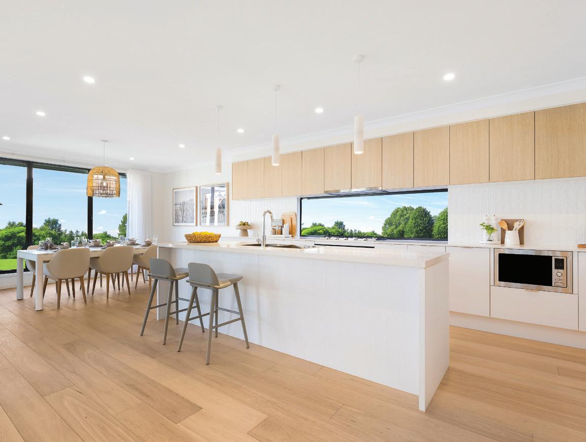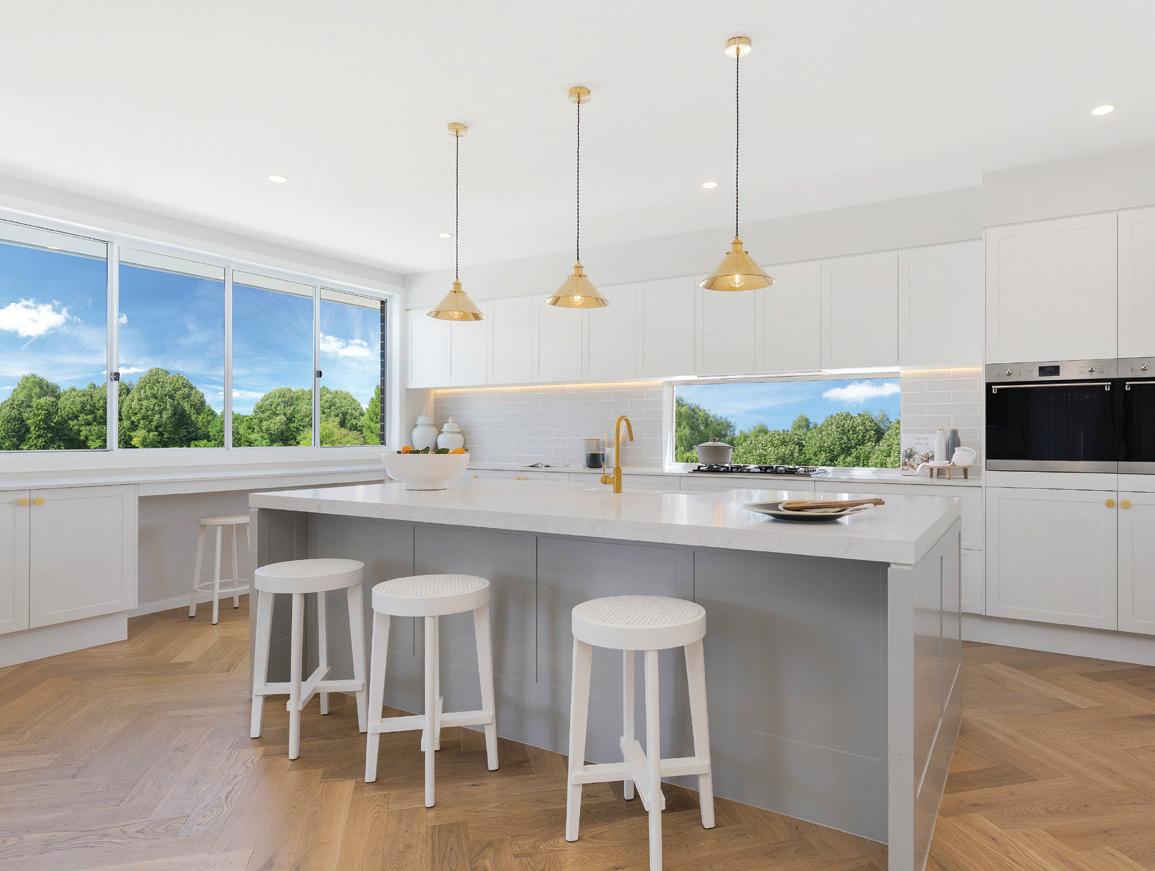• Provide kitchen benchtop extension from edge of hotplate to return under panoramic 1440(h) x 3080mm(w) servery window with 20mm engineered stone benchtop from builder’s range to match kitchen benchtop including additional overhead cupboards and glass splashback to cooktop run from builder’s range where displayed.