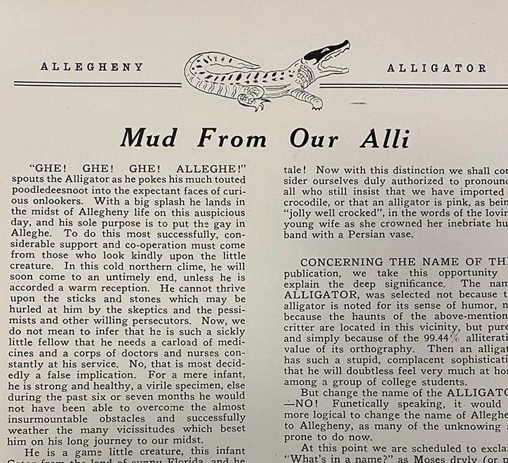 24 Commemorating the 100th Anniversary of the Gator For a century, the Gator has been Allegheny College’s beloved icon. Although there are no alligators native to Western Pennsylvania, that hasn’t deterred the staying power of the iconic character.