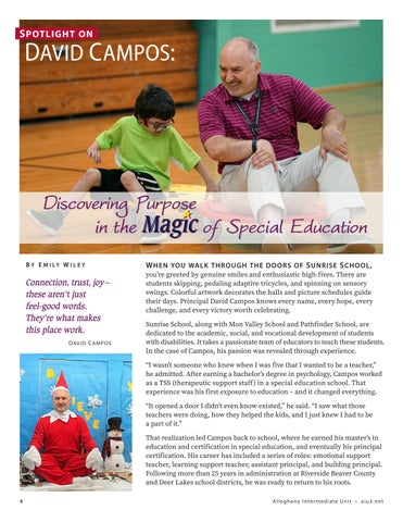 W hen you W alk through the D oors o F s unrise s chool , you’re greeted by genuine smiles and enthusiastic high-fives. There are students skipping, pedaling adaptive tricycles, and spinning on sensory swings. Colorful artwork decorates the halls and picture schedules guide their days. Principal David Campos knows every name, every hope, every challenge, and every victory worth celebrating.