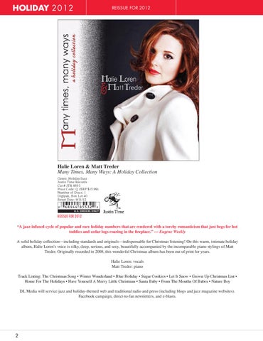 Halie Loren & Matt Treder Many Times, Many Ways: A Holiday Collection Genre: Holiday/Jazz Justin Time Records Cat # JTR 8553 Price Code: Q (SRP $15.99) Number of Discs: 1 Digipak, Box Lot 40 Street Date: 9/11/12 d