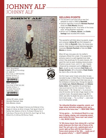 • This wonderful self-titled album was first released on vinyl in 1966 by Rozenblit. • Features legendary musicians Hermeto Paschoal (flute) and Airto Moreira (drums). • Highly regarded as the “true father of the bossa nova” among Brazilian musicians. • Artists such as Simone, Alcione, and Emilio Santiago have recorded Alf’s tracks.